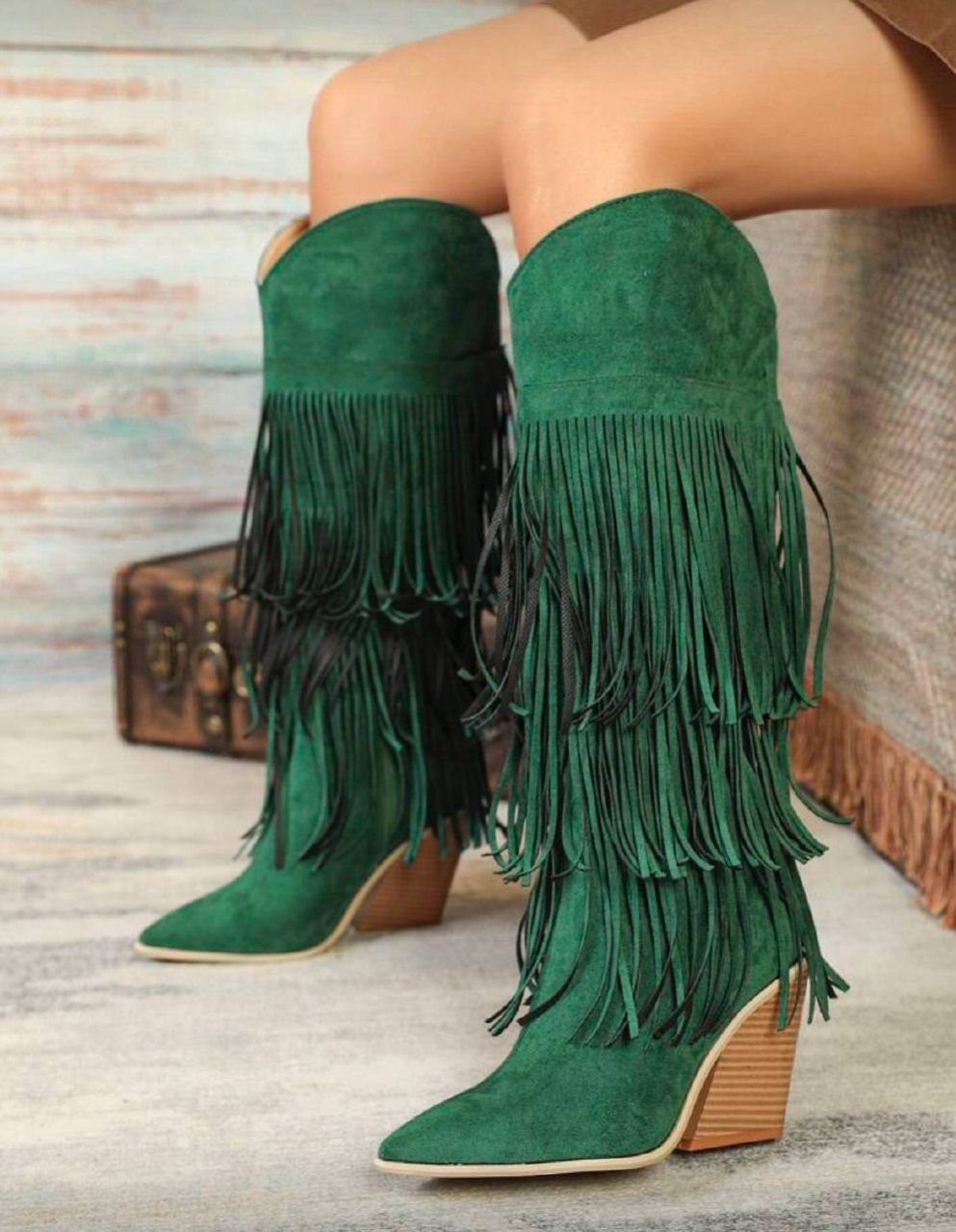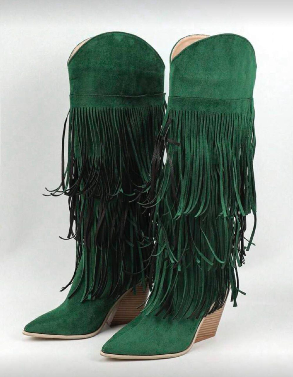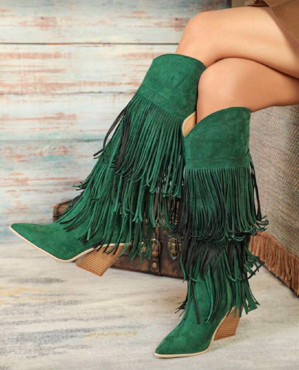 بوت نسائية موضة خريف/شتاء 2025 ذات كعب سميك مريح من الجلد المدبوغ المزيف بطبعة هندسية خضراء وأطراف مهترئة، بوت كاوبوي غربية مريحة ذات كعب عالي بنقشة خشبية وأصابع مدببة