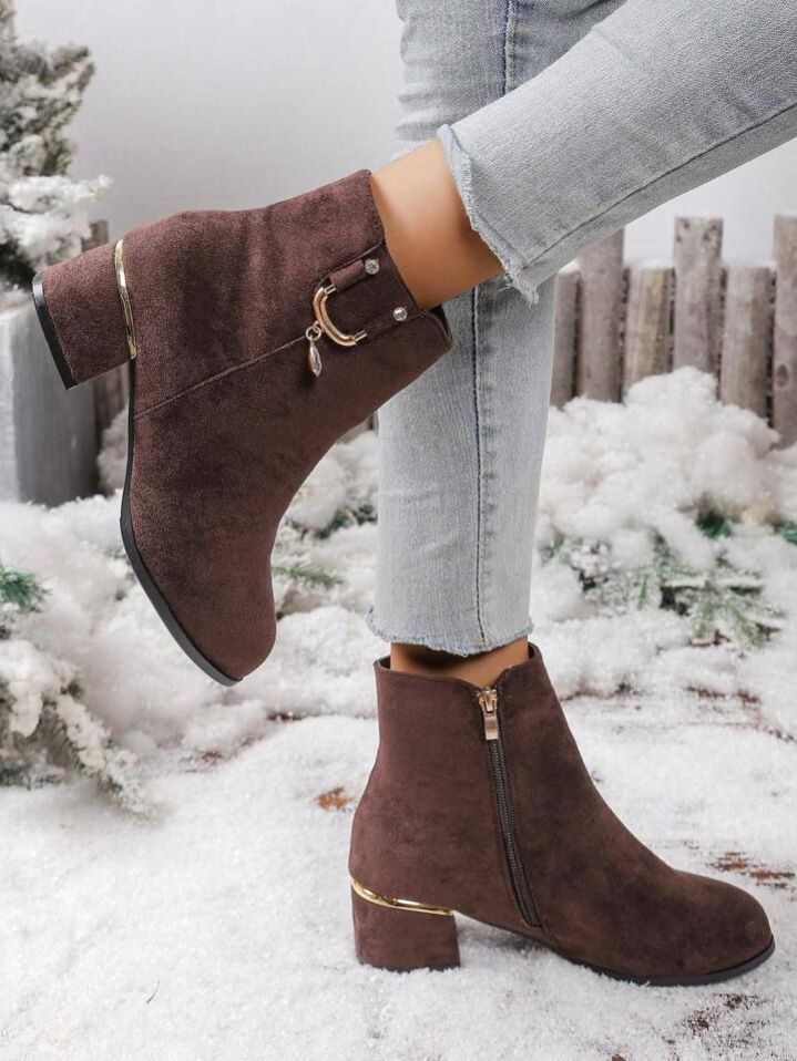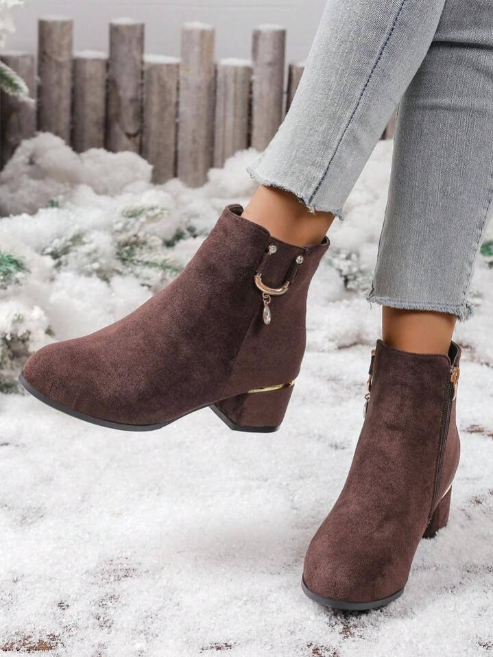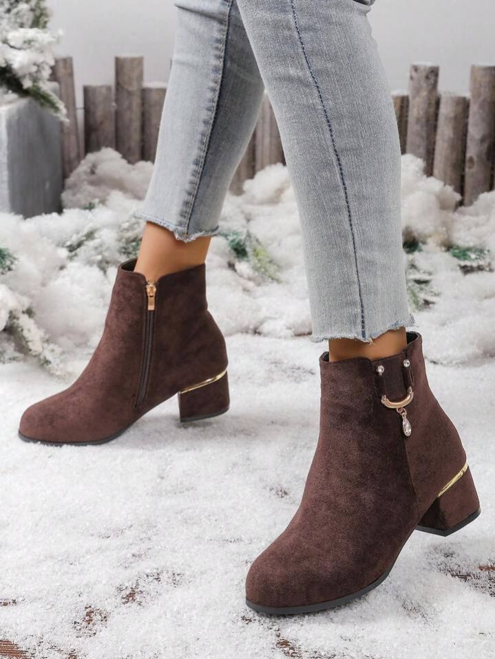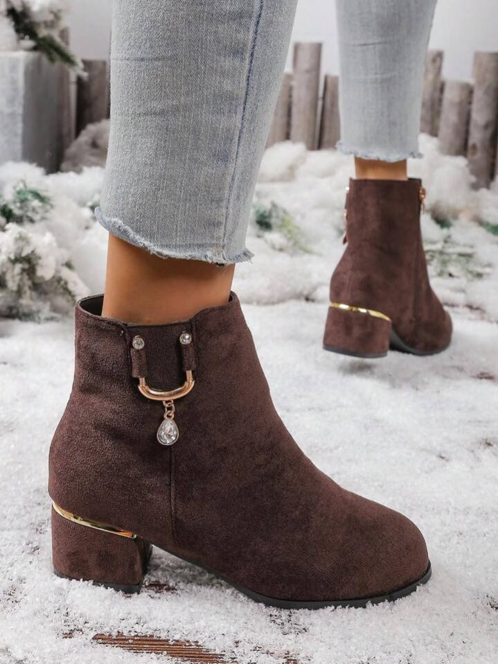 حذاء نسائي قصير باللون البني بكعب متوسط سميك وتصميم بسحاب وقلادة من الكريستال، مثالي للتنسيق مع فستان أسود، عصري وأنيق.