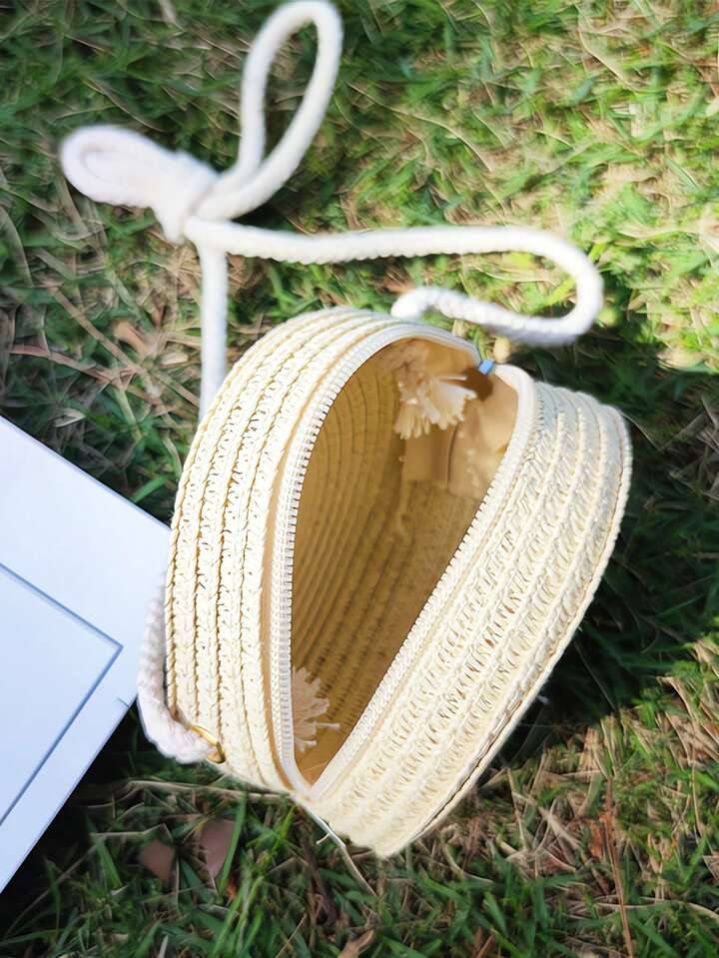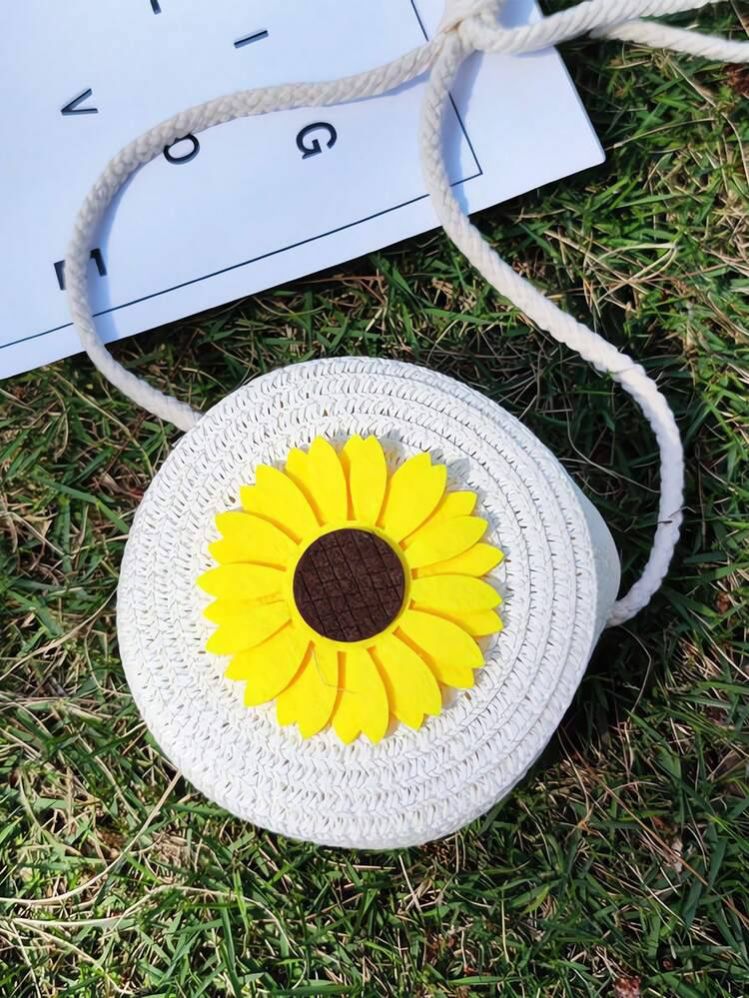 0 Review Of Product حقيبة كتف دائرية صغيرة مزينة بأزهار دوار الشمس، مزودة بحزام عابر، حقيبة شاطئ صيفية منسوجة من القش، حقيبة يد محبوكة للنساء والفتيات والأطفال مع محفظة للنقود