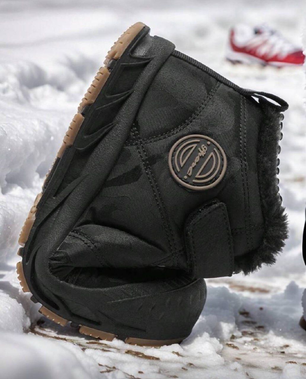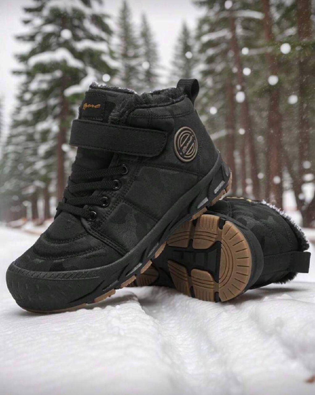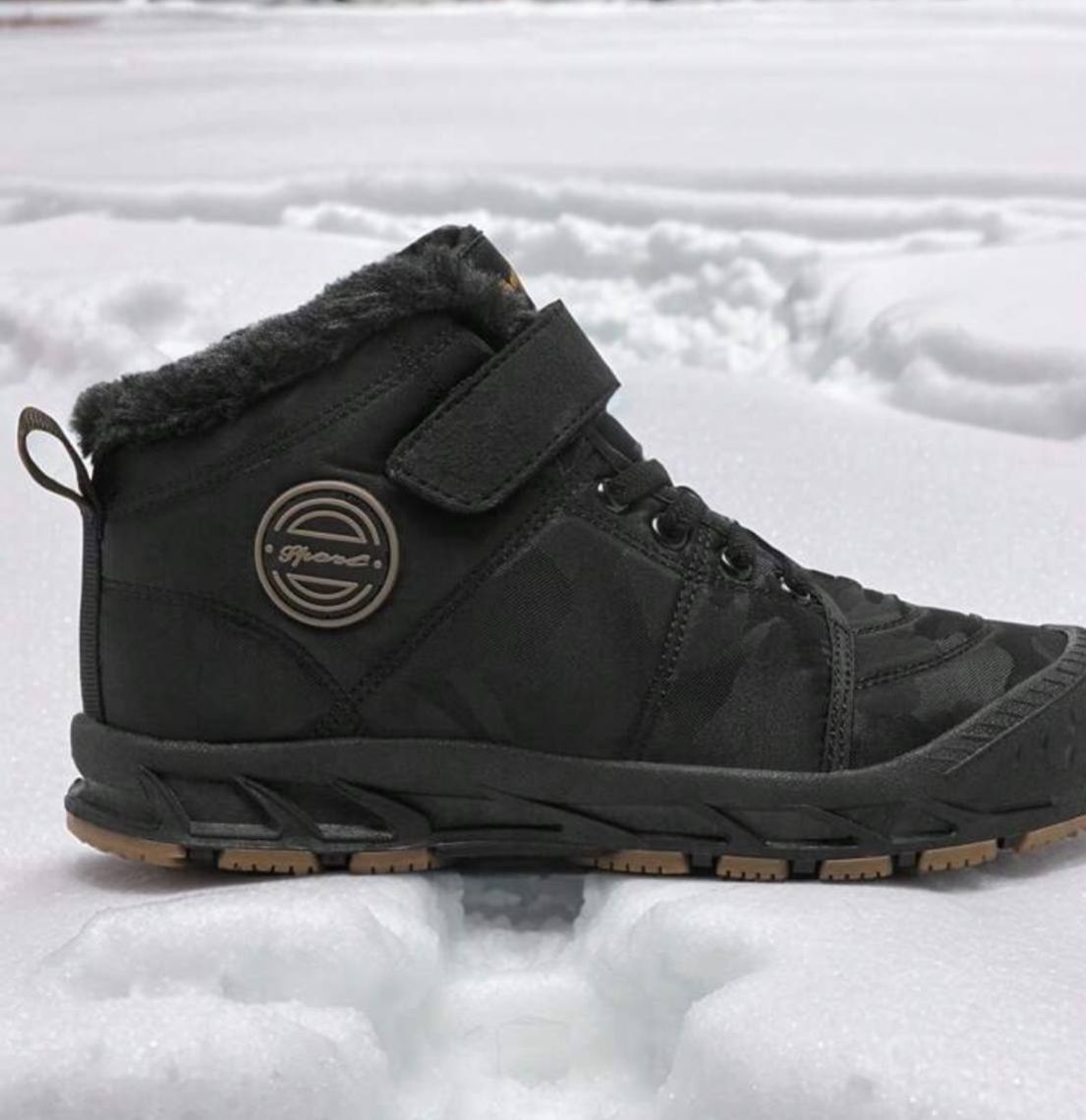 زوج من بوت الثلج للمراهقين، باللون الأسود، بنظام ربط بسحاب وخيط، بتصميم حرفي، بنعل سميك من مطاط TPR، بزخرفة حرفية من القماش، بتصميم أنف دائري متوسط الطول، مبطنة بفرو، مناسبة للاستخدام اليومي والخارجي في الشتاء، بوت ثلج سوداء للمراهقين