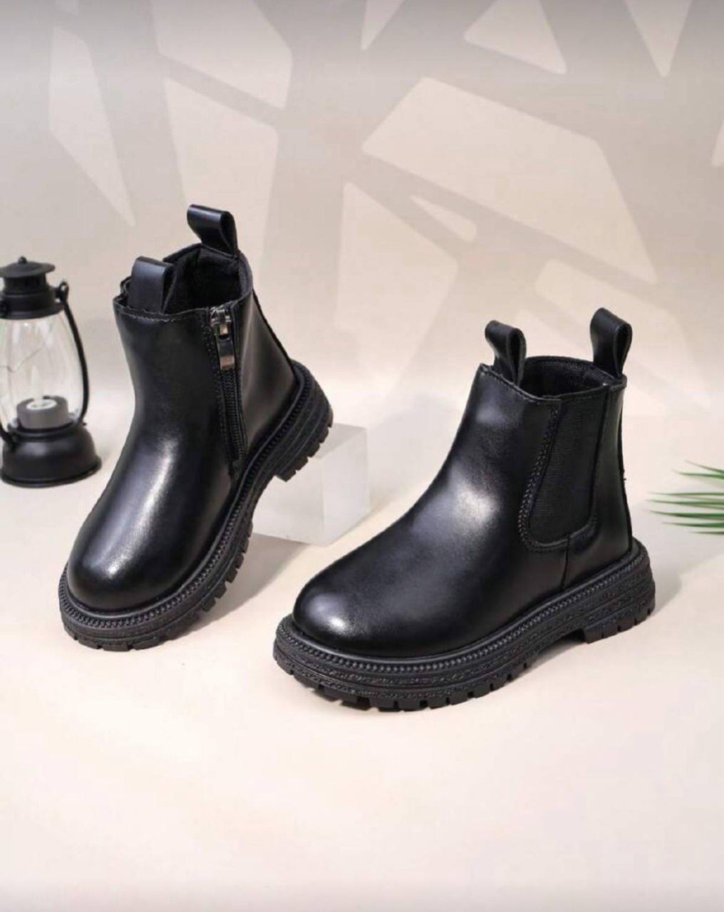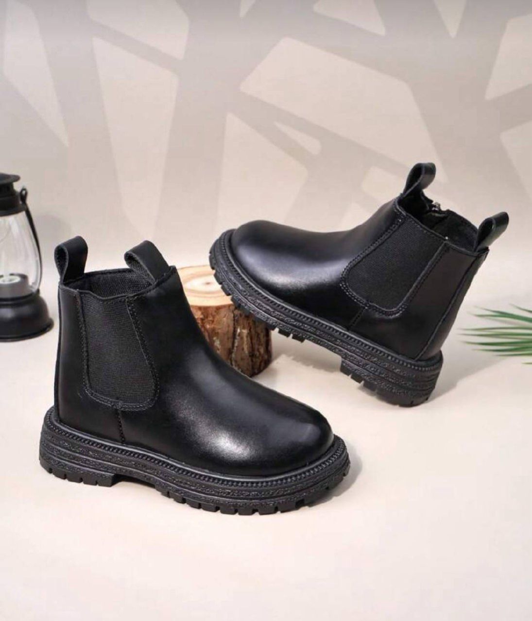 زوج من بوت تشيلسي للأطفال/الأطفال الصغار من الجلد الناعم الأسود والقماش المطاطي، برأس مستدير، وبنعل مانع للانزلاق، أنيقة وجميلة، مناسبة للأولاد والبنات، للاستخدام اليومي، المدرسة، والمناسبات، للخريف والشتاء