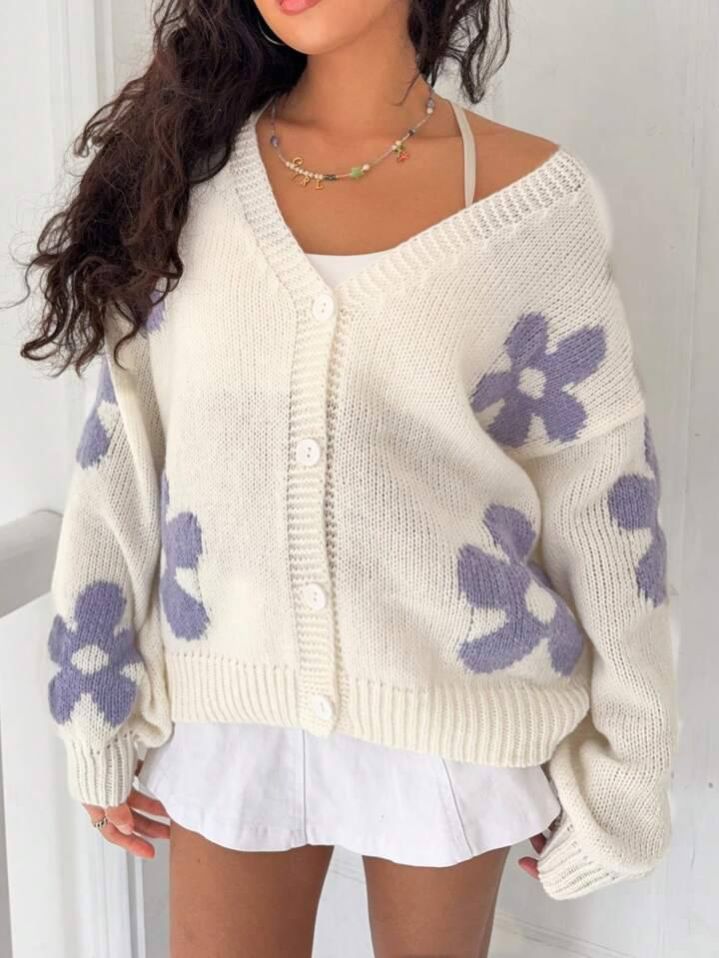 سترة كارديجان نسائية محبوكة بنقشة زهور