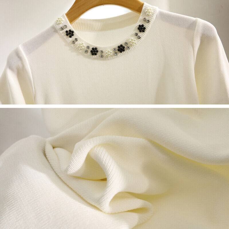 سترة نسائية محبوكة بأكمام قصيرة وقميص مطرز بالخرز وقمصان قصيرة ضيقة وأساسية ناعمة