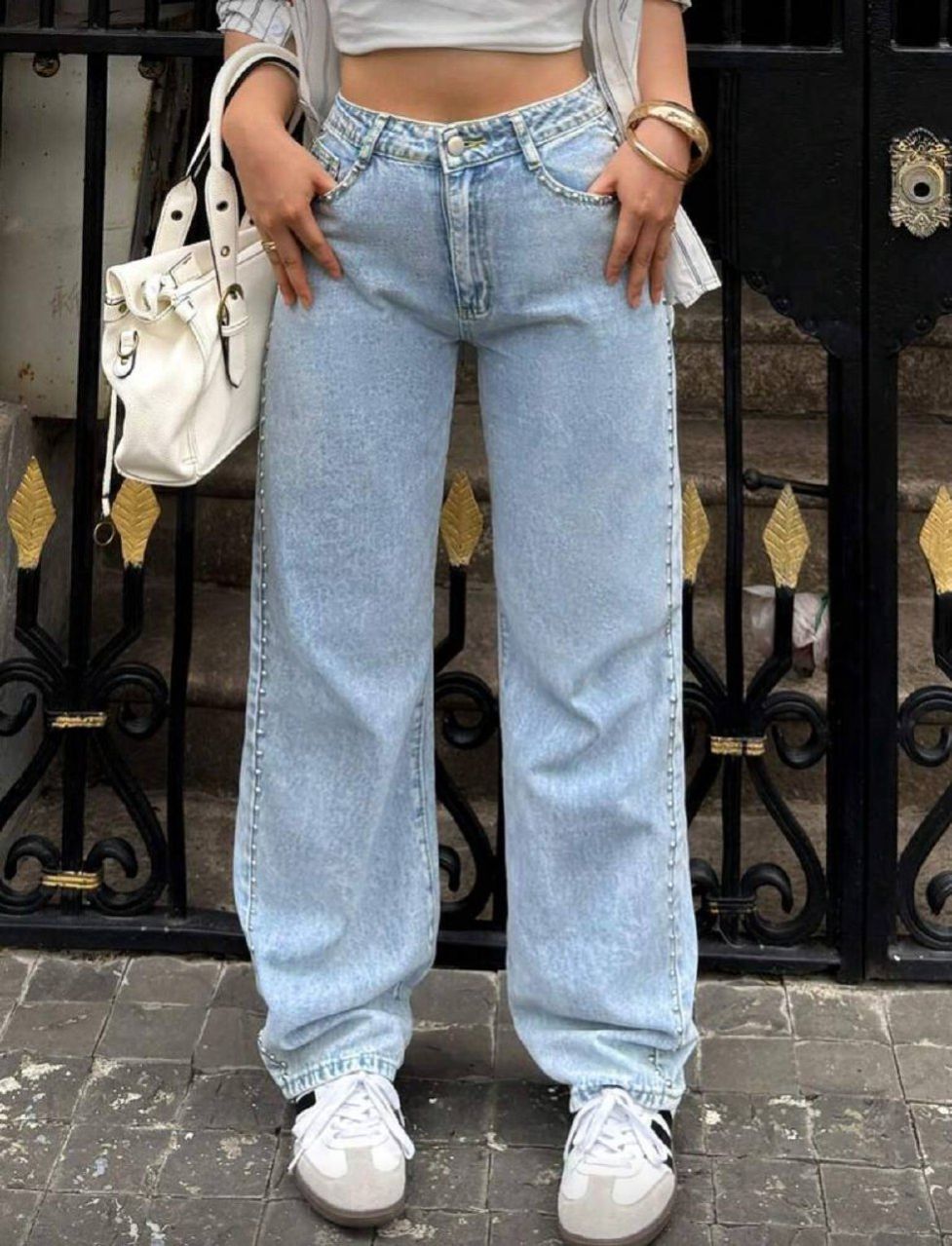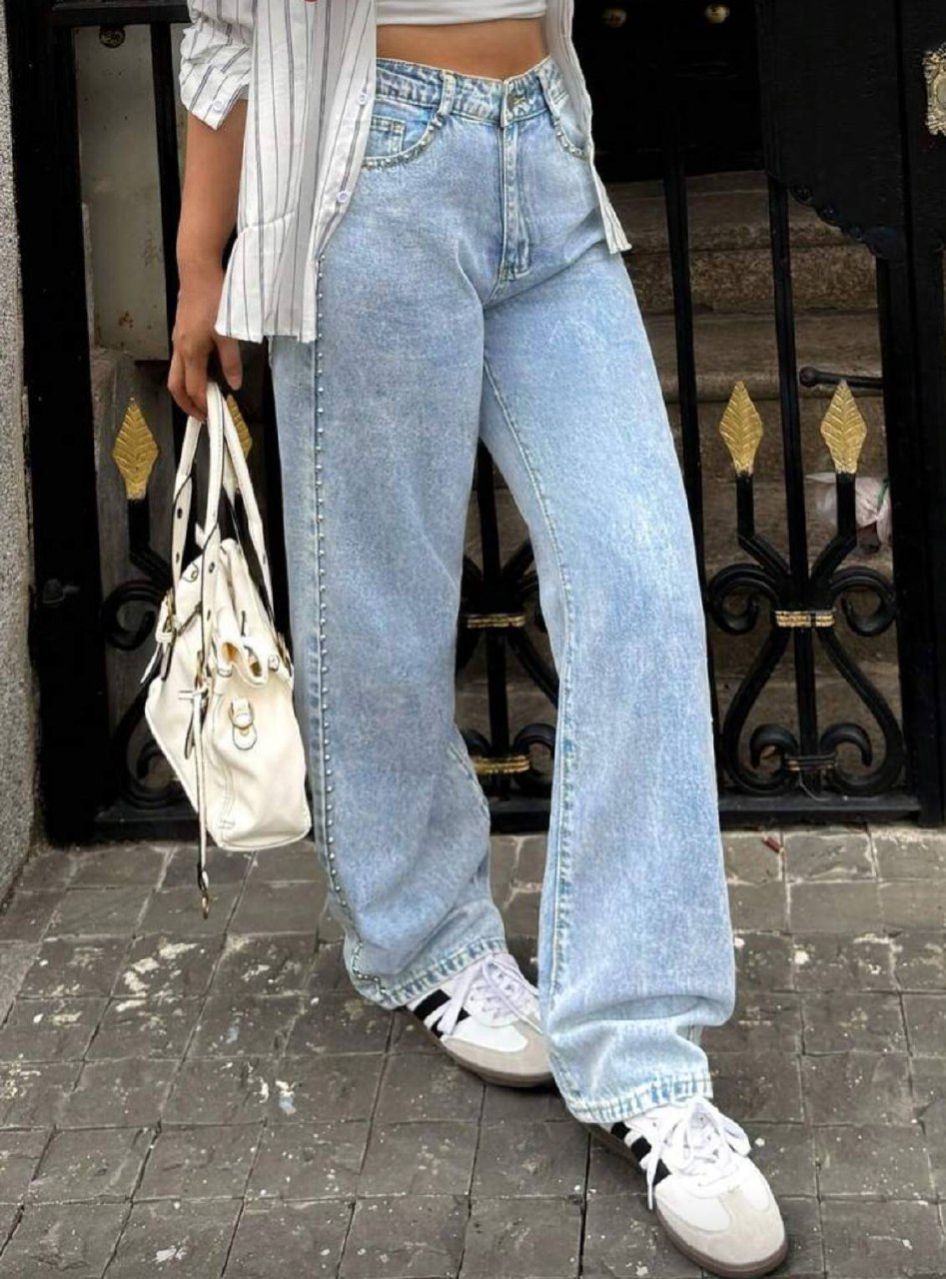 سراويل جينز نسائية كاجوال بغسيل فاتح مع تفاصيل الزخرفة بالنيتات، ساق مستقيمة طويلة مع جيوب، قماش غير مطاطي