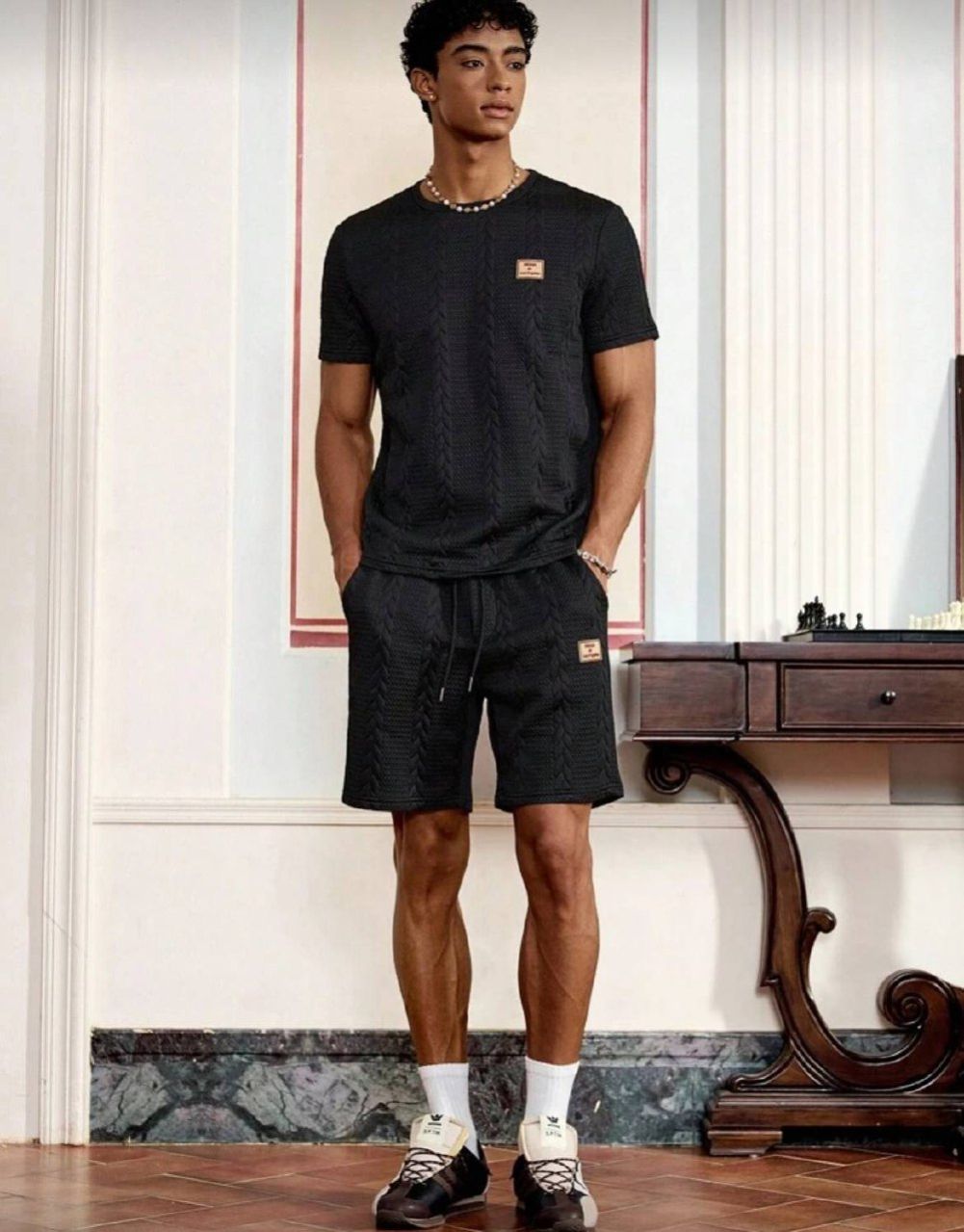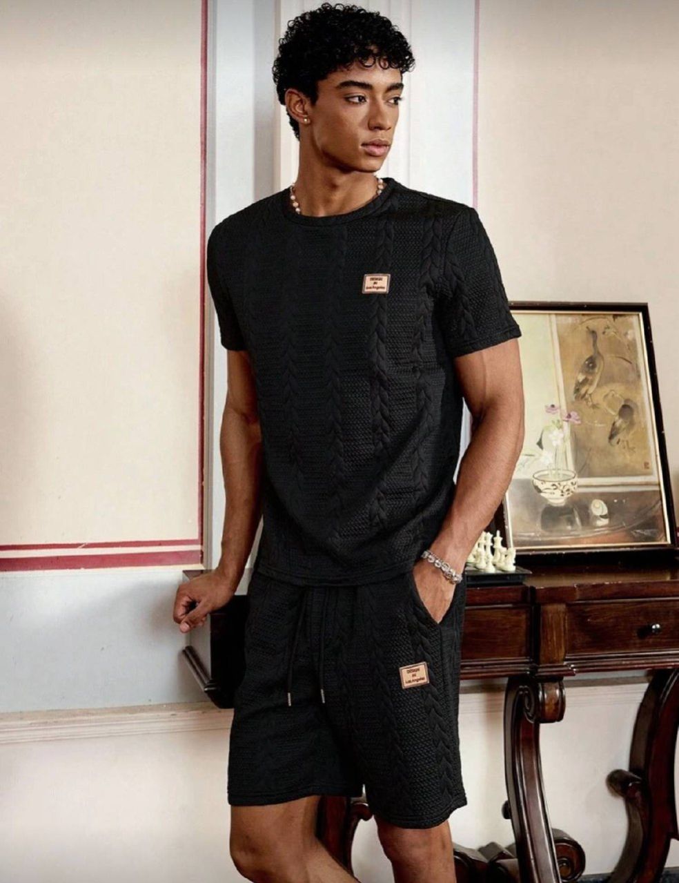 0 Review Of Product طقم تيشيرت قصير الأكمام بطبعة حرفية وشورت كاجوال للرجال، طراز الملابس الشارعية الصيفية