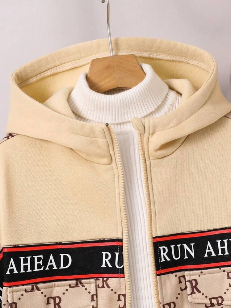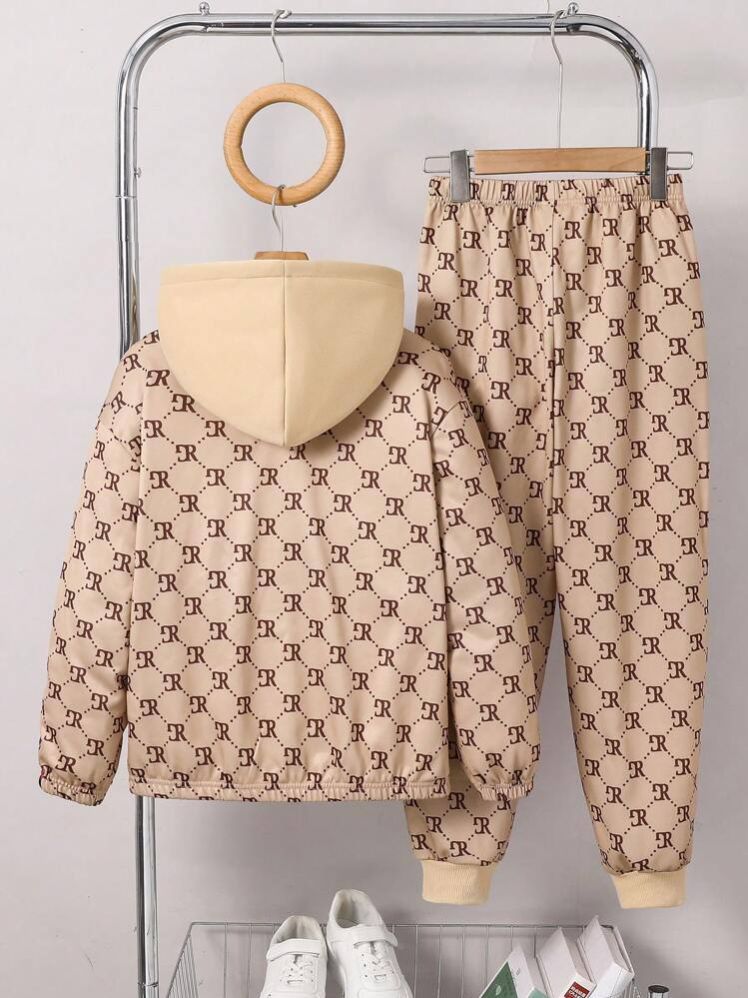 طقم من قطعتين من SHEIN للأولاد الصغار، سويت شيرت بقلنسوة وبنطال رياضي بحافة مضلعة، مناسب للتنقل والمدرسة والعطلات والرياضة والربيع/الصيف/الخريف/الشتاء