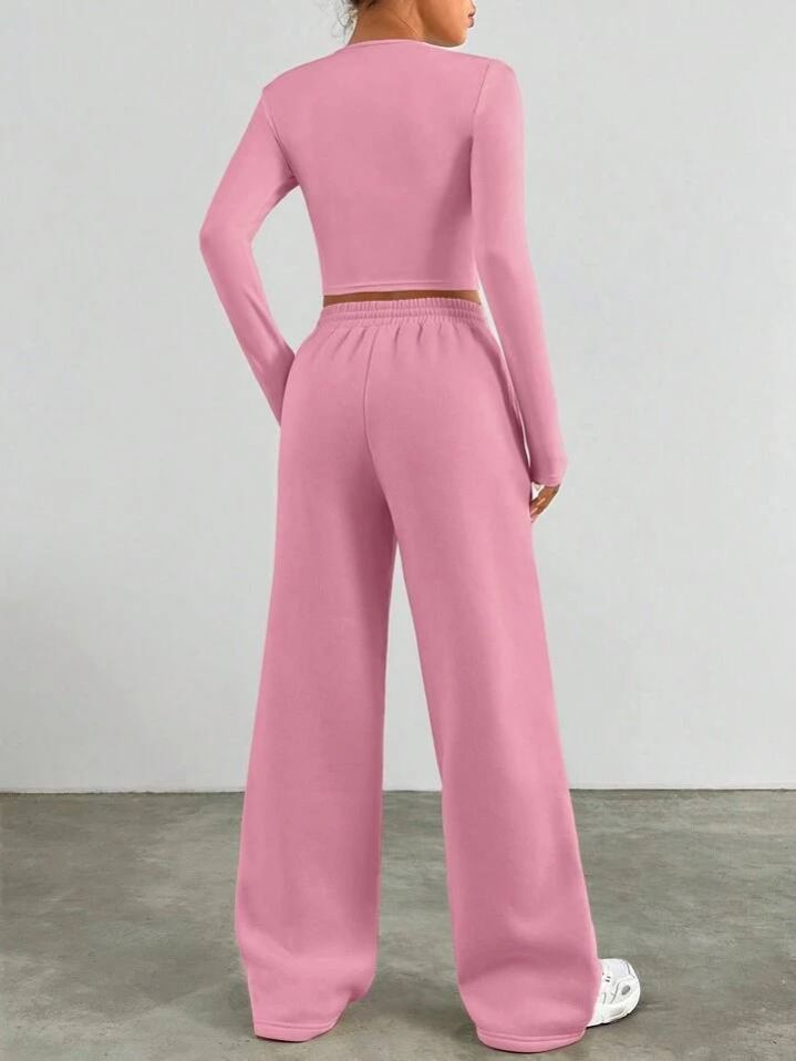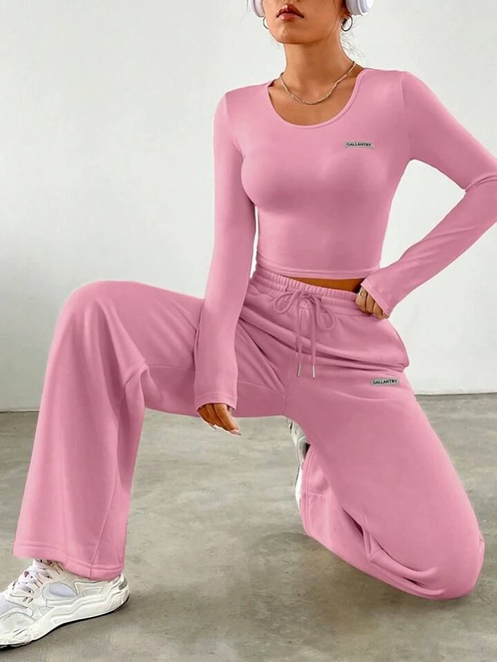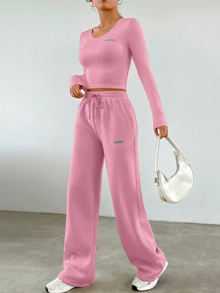 طقم من قطعتين من SHEIN EZwear للنساء، تيشيرت مطبوع عليه حروف وبنطلون برباط خصر
