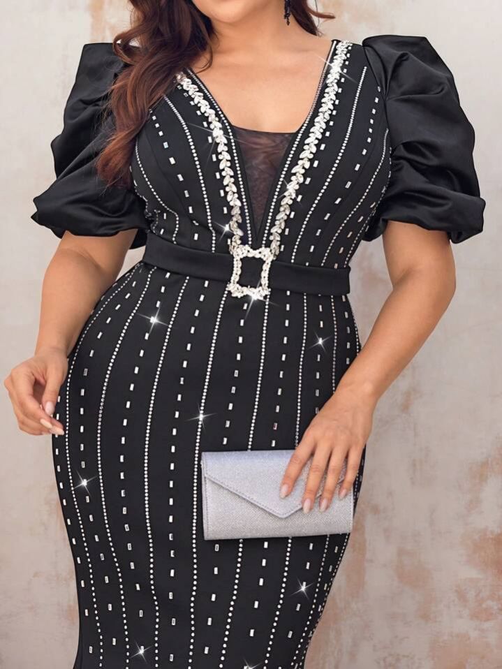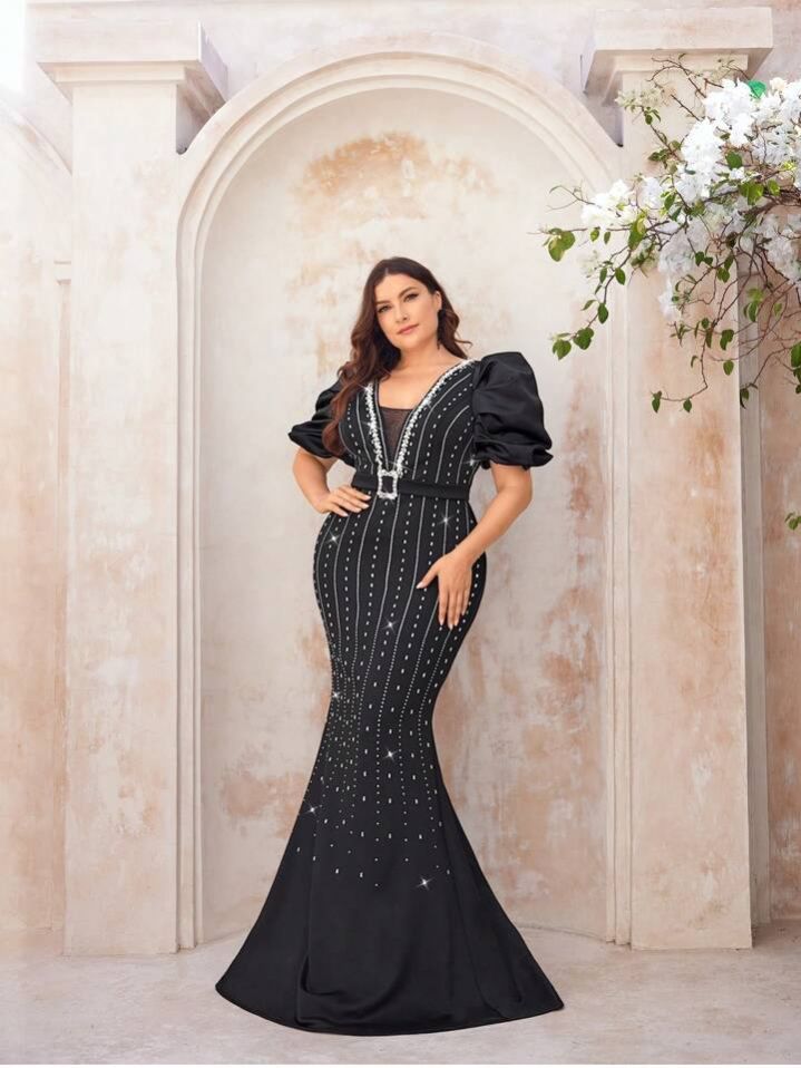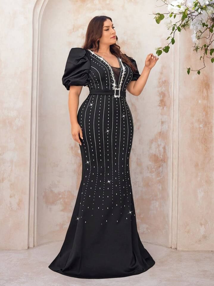فستان سهرة أنيق من SHEIN Belle مقاس كبير أسود فاخر مزين بالكريستال الثقيل ومزين بأحجار الراين الساخنة ونمط المحكمة وأكمام منتفخة مكشكشة ورقبة على شكل حرف V عميقة وفساتين سهرة أنيقة على شكل حورية البحر