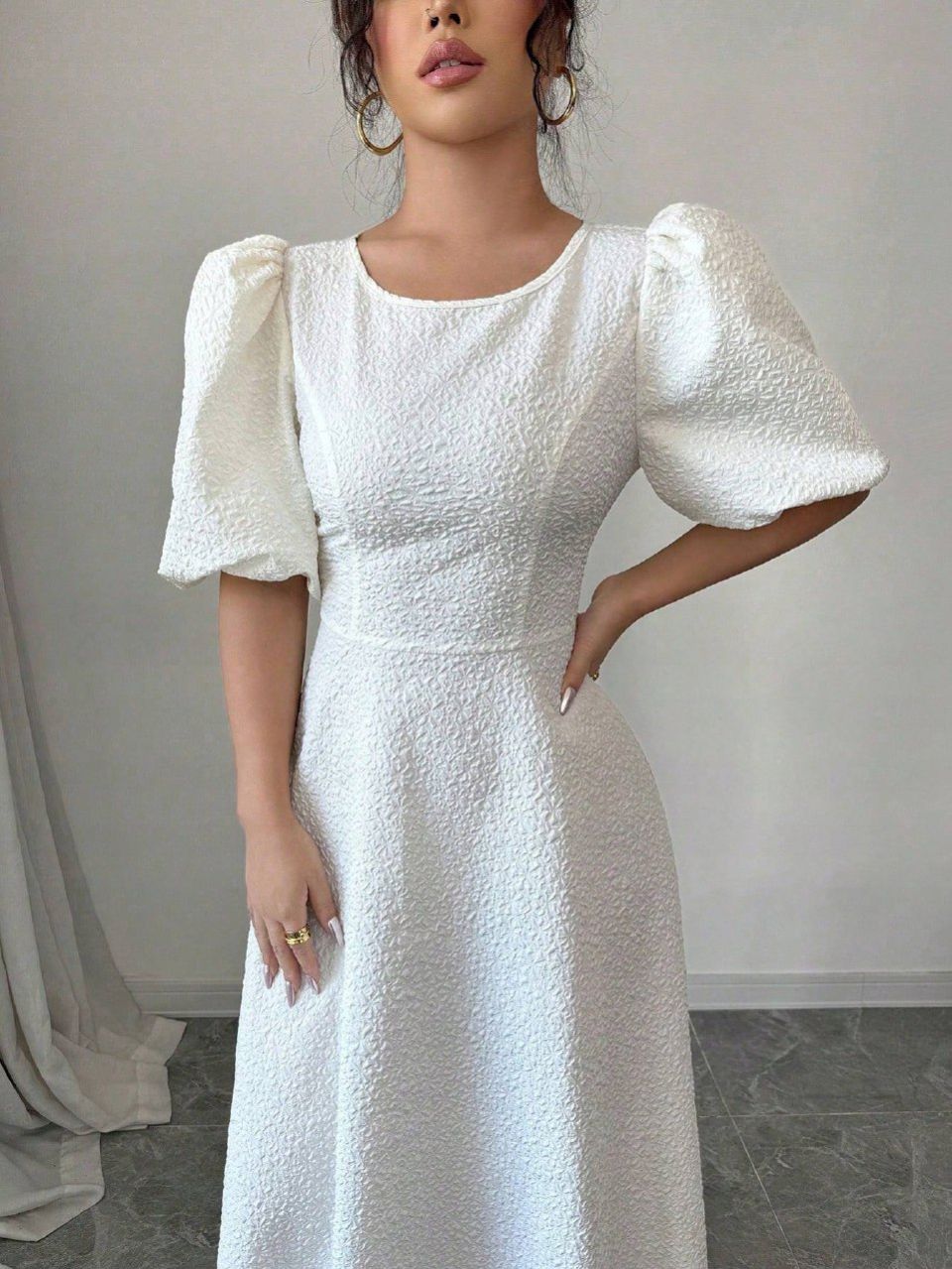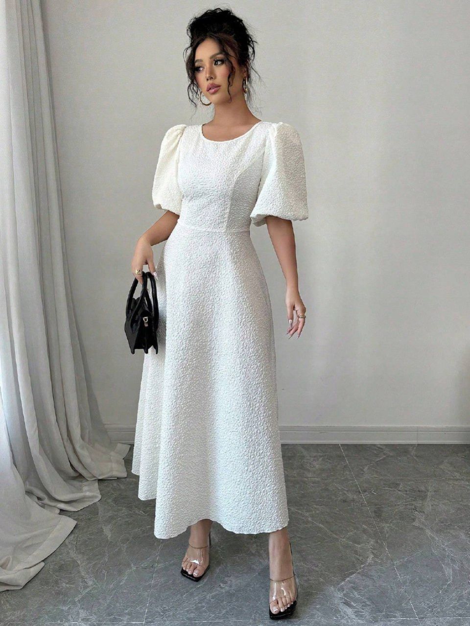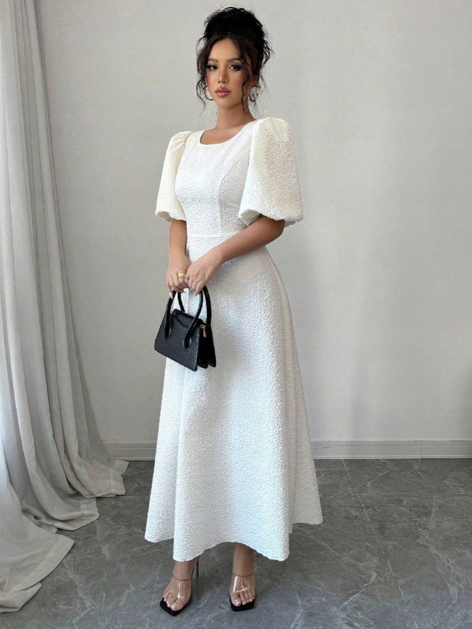 فستان كوكتيل ماكسي من شي إن، بلون كريمي، بنقشة الجاكار، وأكمام مثقوبة، مقاس