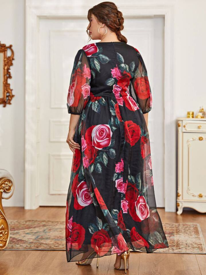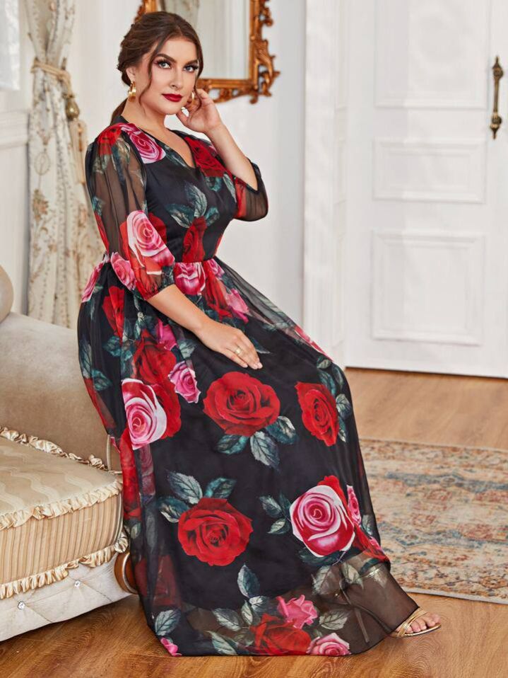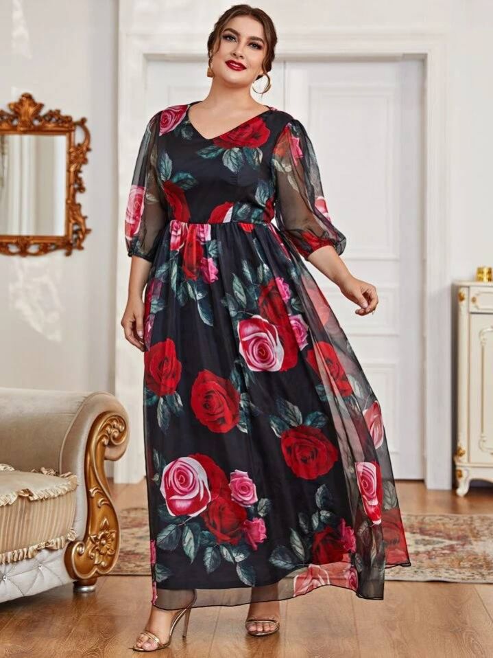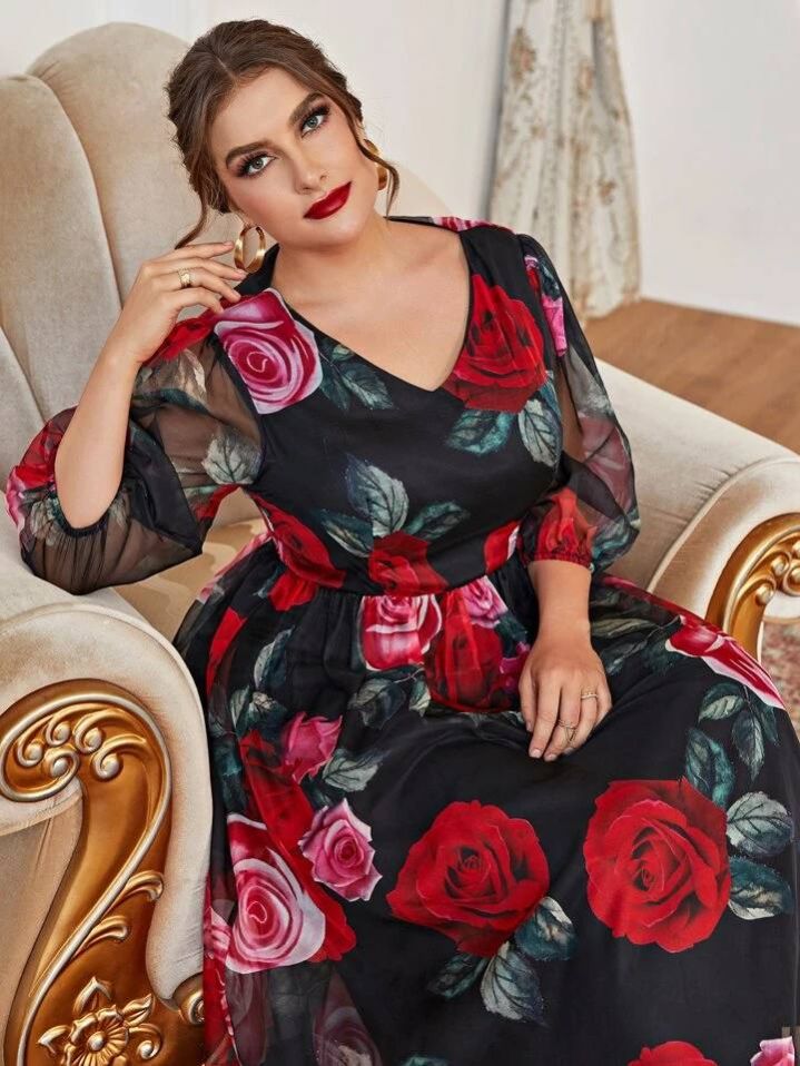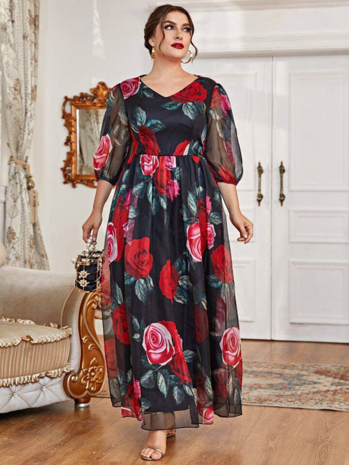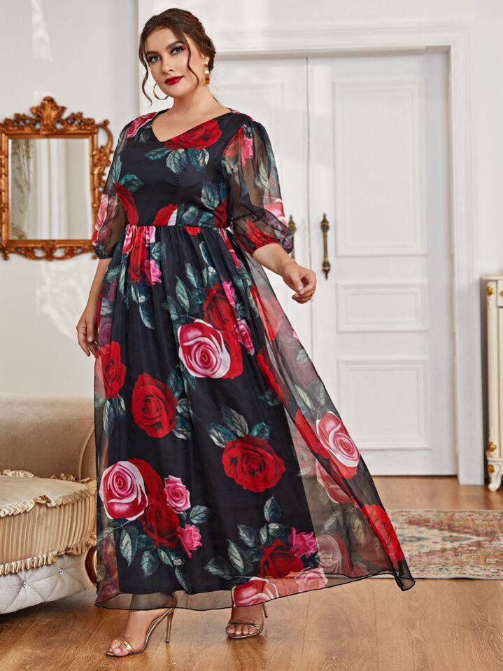 فستان متعدد الطبقات بنقشة زهور بمقاسات كبيرة