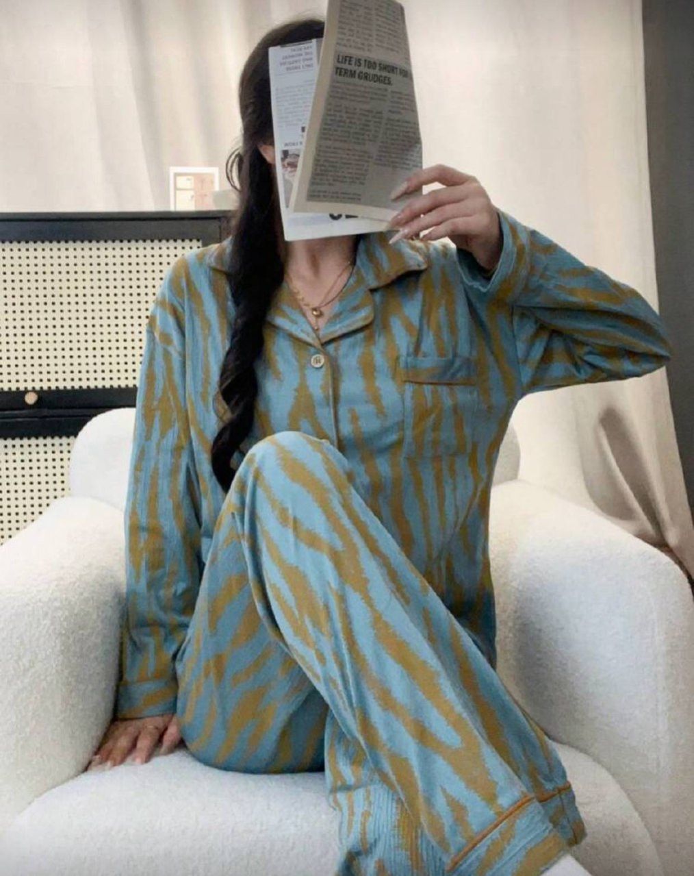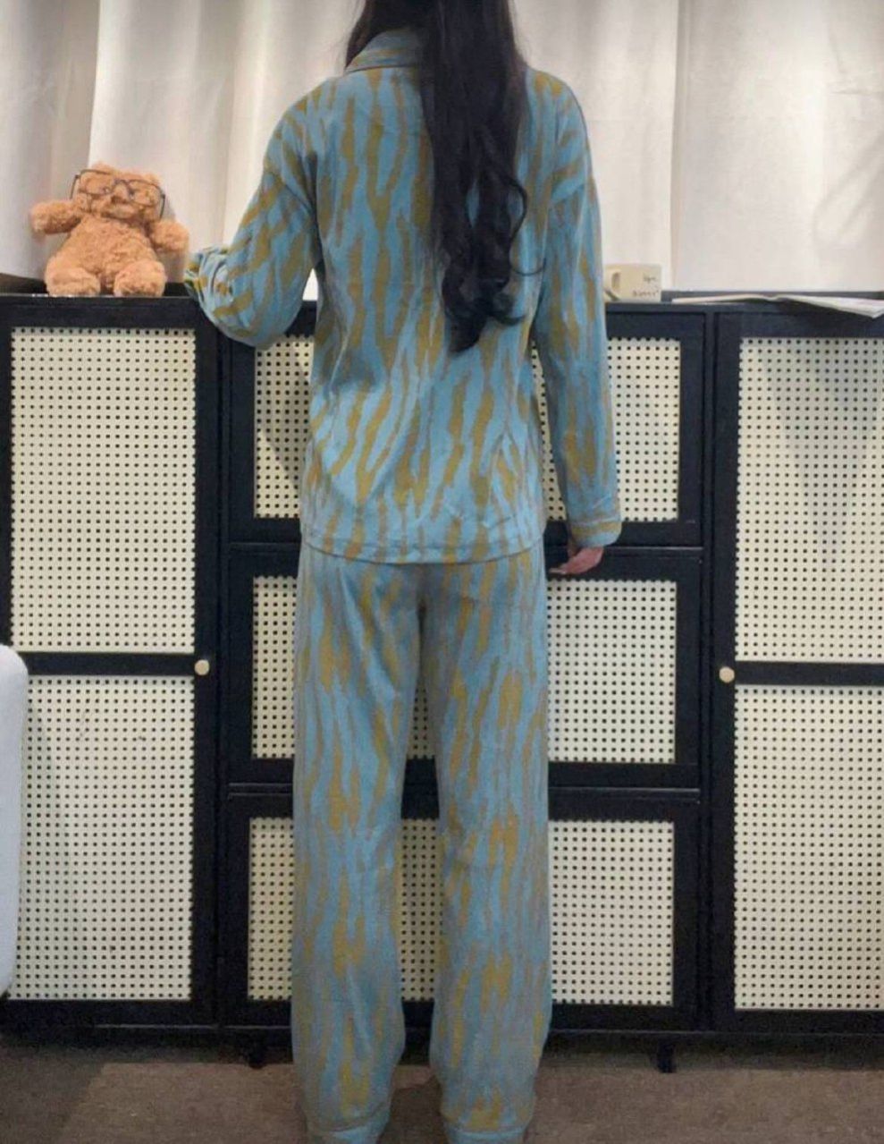مجموعة بيجامة للنساء تتكون من ملابس علوية كم طويل مفتوحة بأزرار وبنطال، مصممة بشريط غير متماثل، أناقة وأزياء عصرية للاستخدام اليومي، مجموعة قطعتين، ملابس خريفية