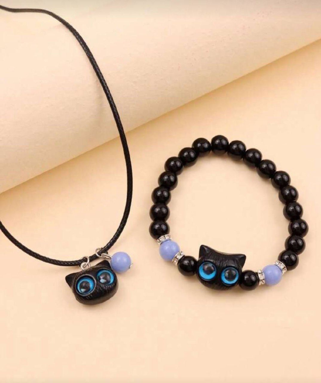 مجموعة مكونة من 2 قطعة من المجوهرات الأنيقة والجميلة بتصميم بسيط، سوار وقلادة بشكل قطة سوداء تضيء في الظلام، مناسبة للارتداء اليومي والمناسبات والأعياد