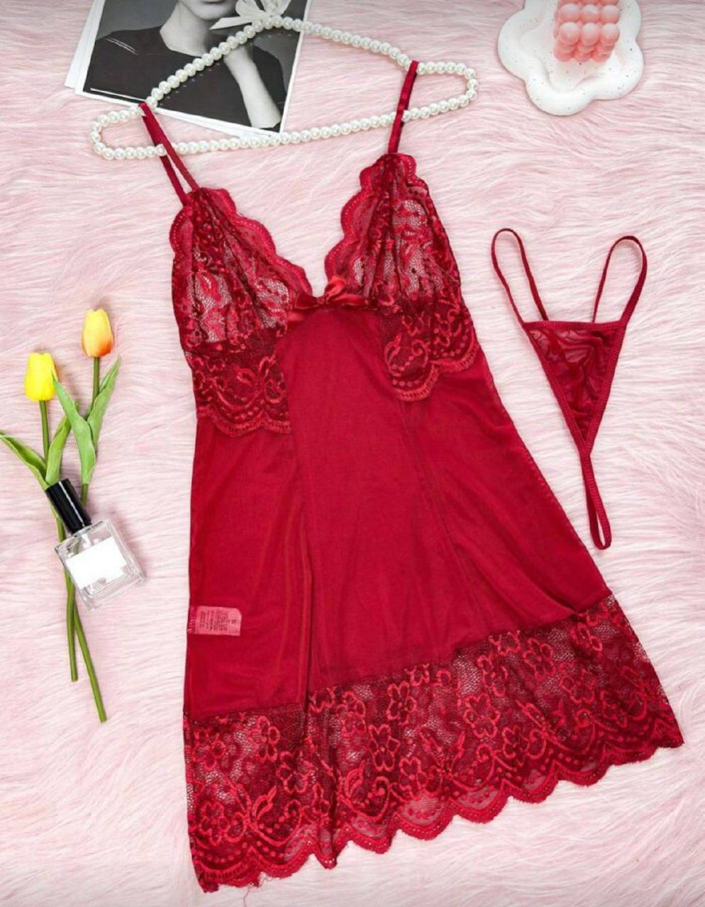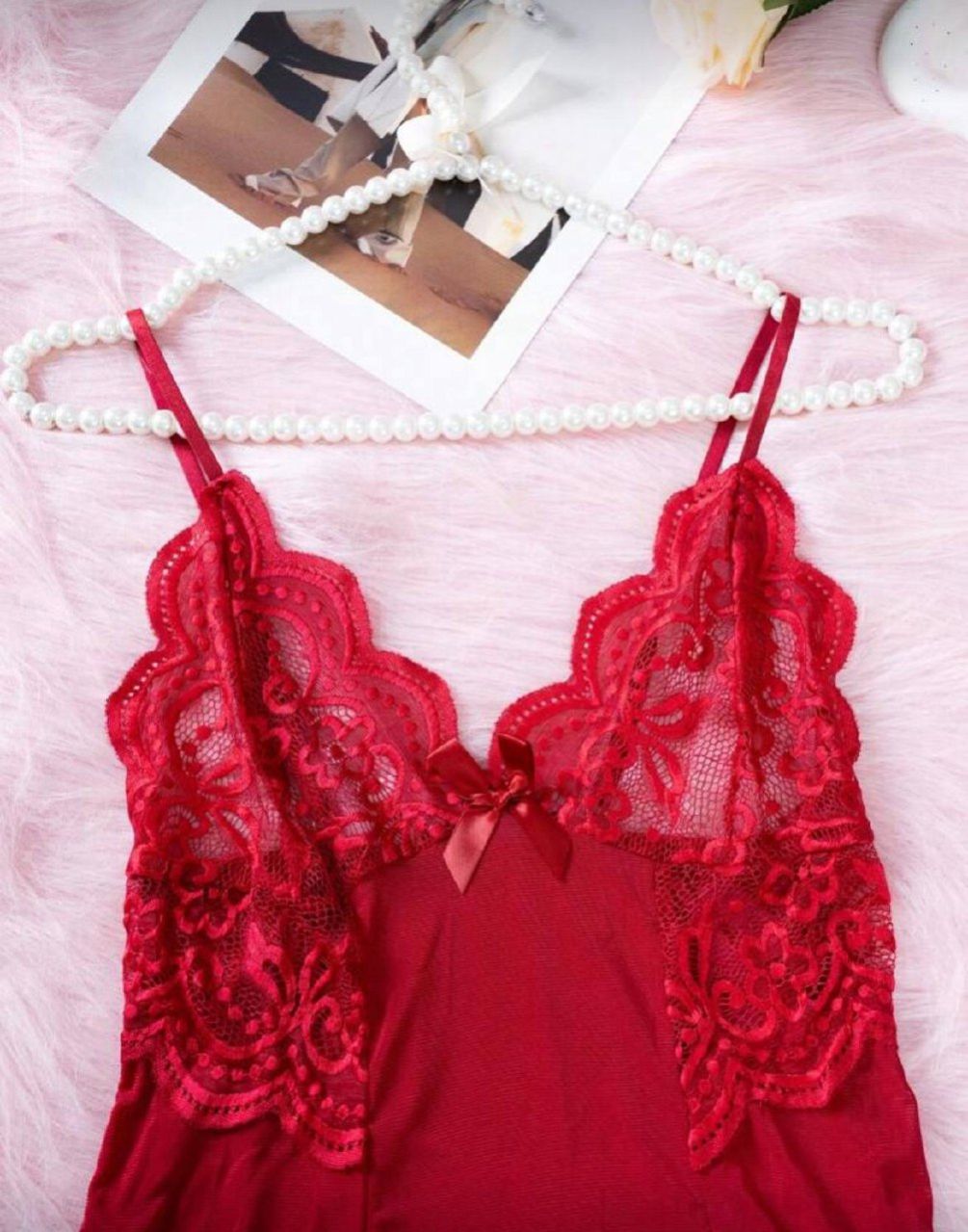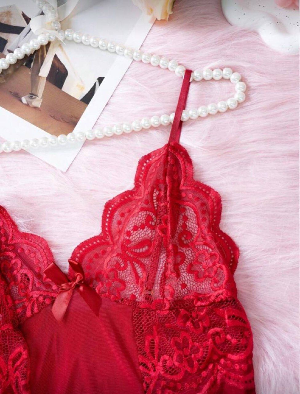 2 قطعة من مجموعة ملابس النوم الحريرية الشفافة ذات الطبعة الدانتيل الأحمر الجذاب للنساء، مناسبة للارتداء في المنزل أو العطلات أو الحفلات الخاصة، ملابس نوم جذابة للسهرات