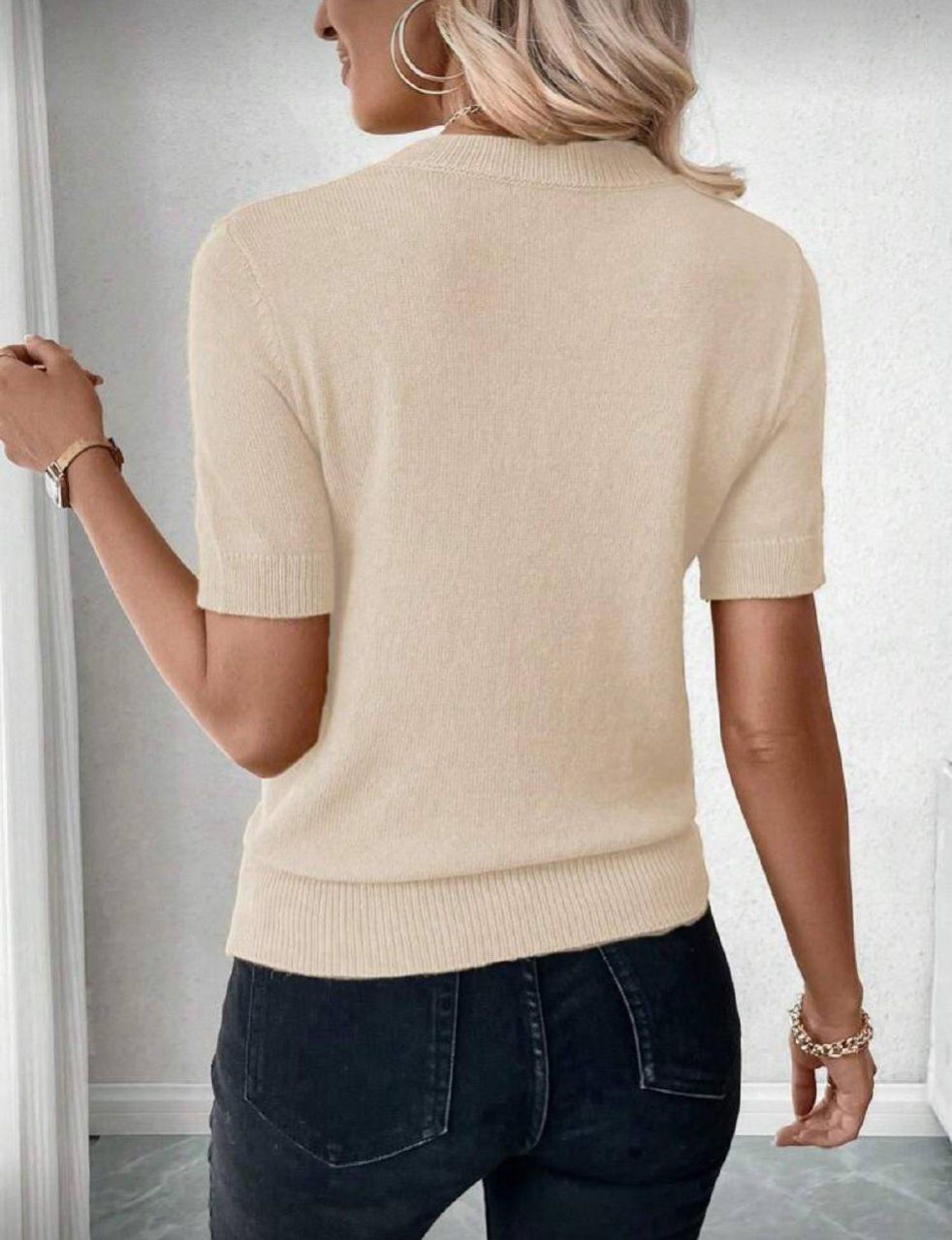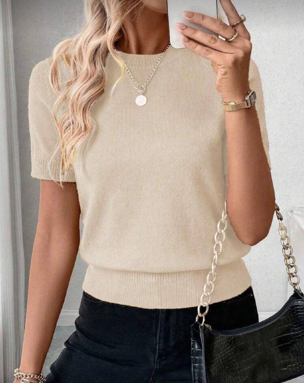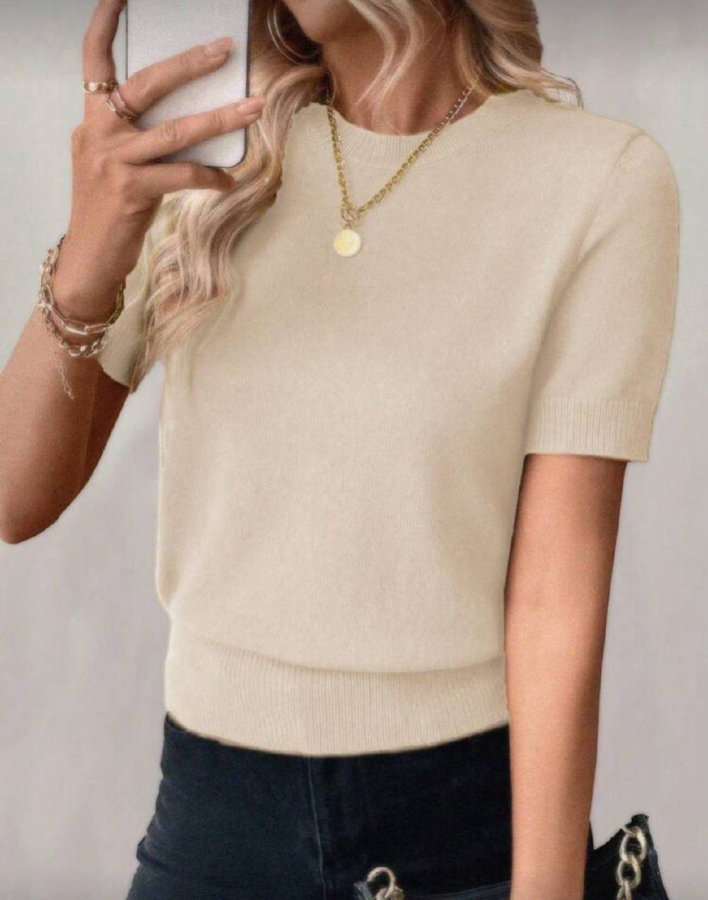 Calvaya ملابس علوية محبوكة كاجوال للنساء ذات لون أحادي وياقة مستديرة وأكمام قصيرة
