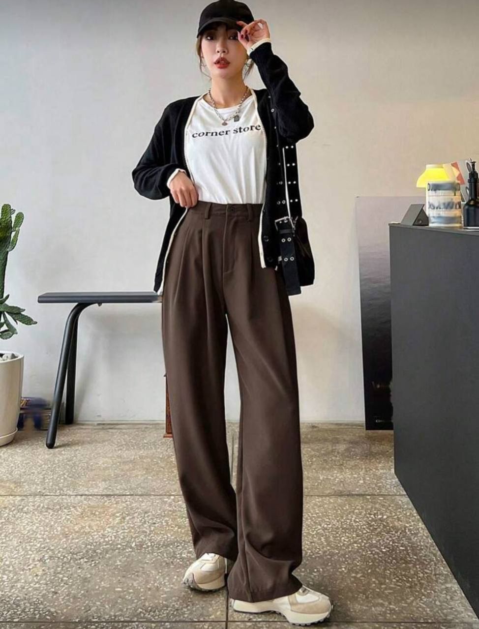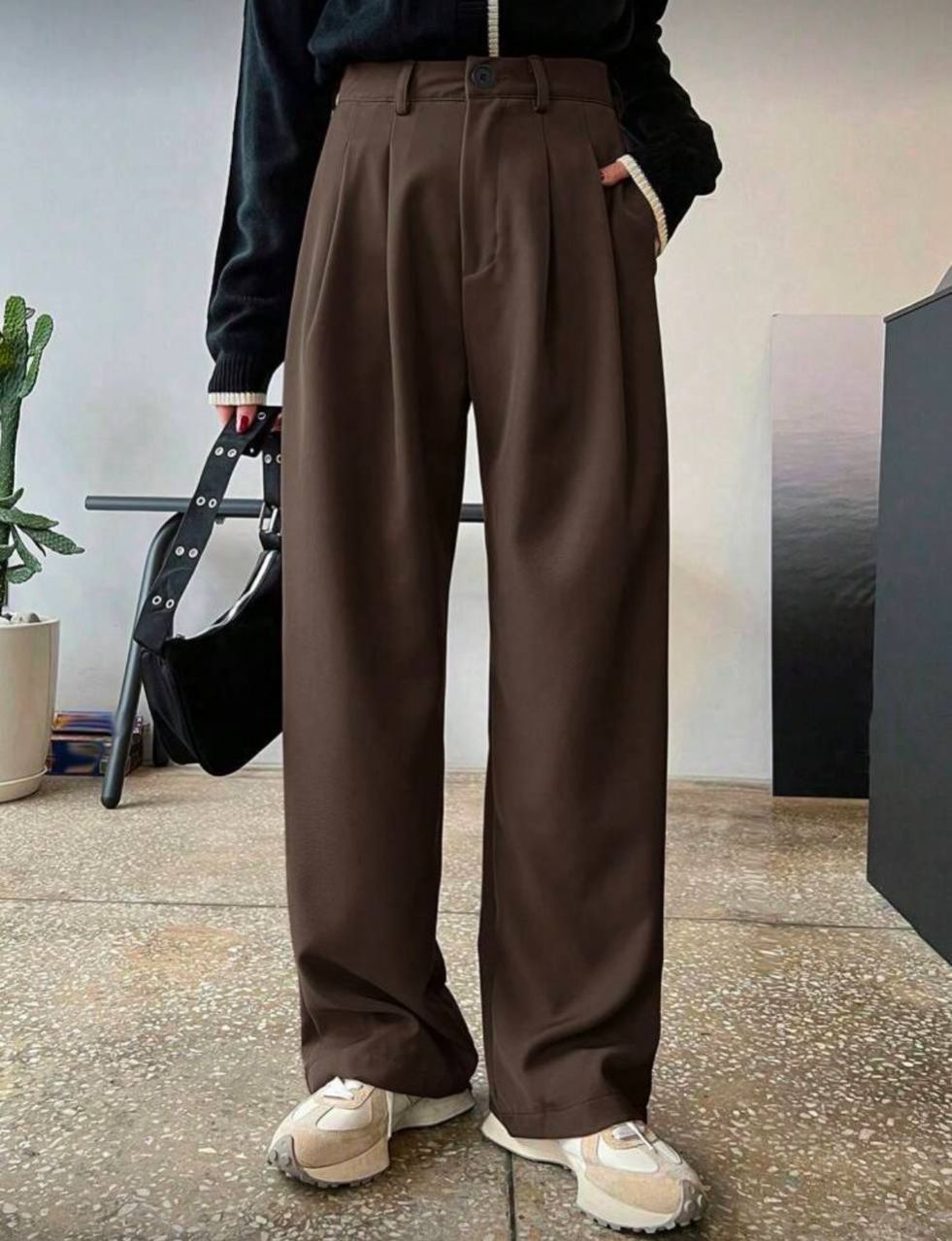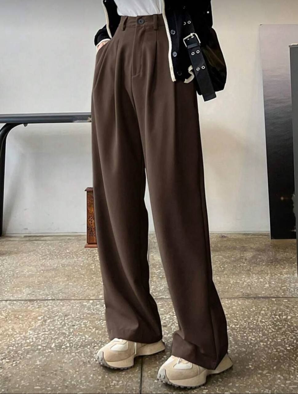 DAZY بنطلون نسائي بقصة مستقيمة ذو لون أحادي، بنطلون نسائي كاجوال للخريف المتأخر، بخصر عالي وساق واسعة، لون بني داكن فضفاض، بنطلون نسائي للارتداء اليومي الكاجوال، بنطلون نسائي للفساتين، بنطلون للمعلمات