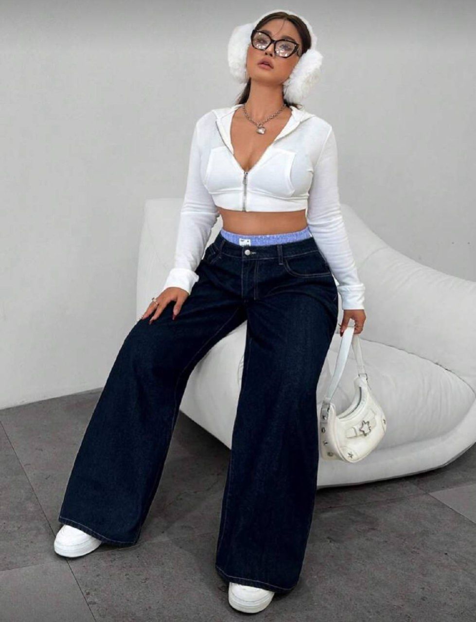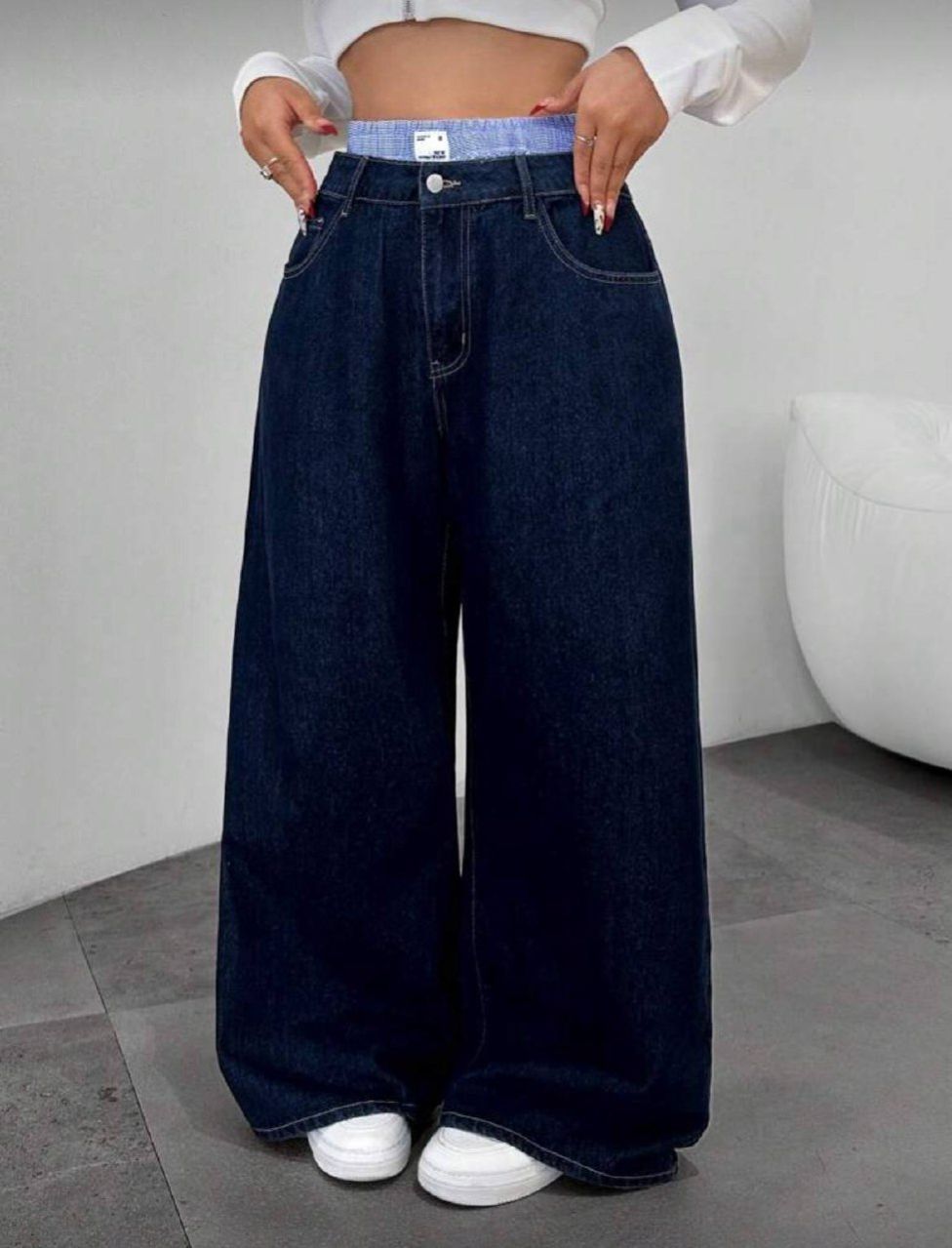 Dripcurv بنطلون جينز مستقيم الساق بتصميم رقعي باللون الأزرق للمرأة البدينة، بأسلوب كاجوال شارع مع لمسة أنيقة، مثالي لإطلالات رأس السنة الجديدة.