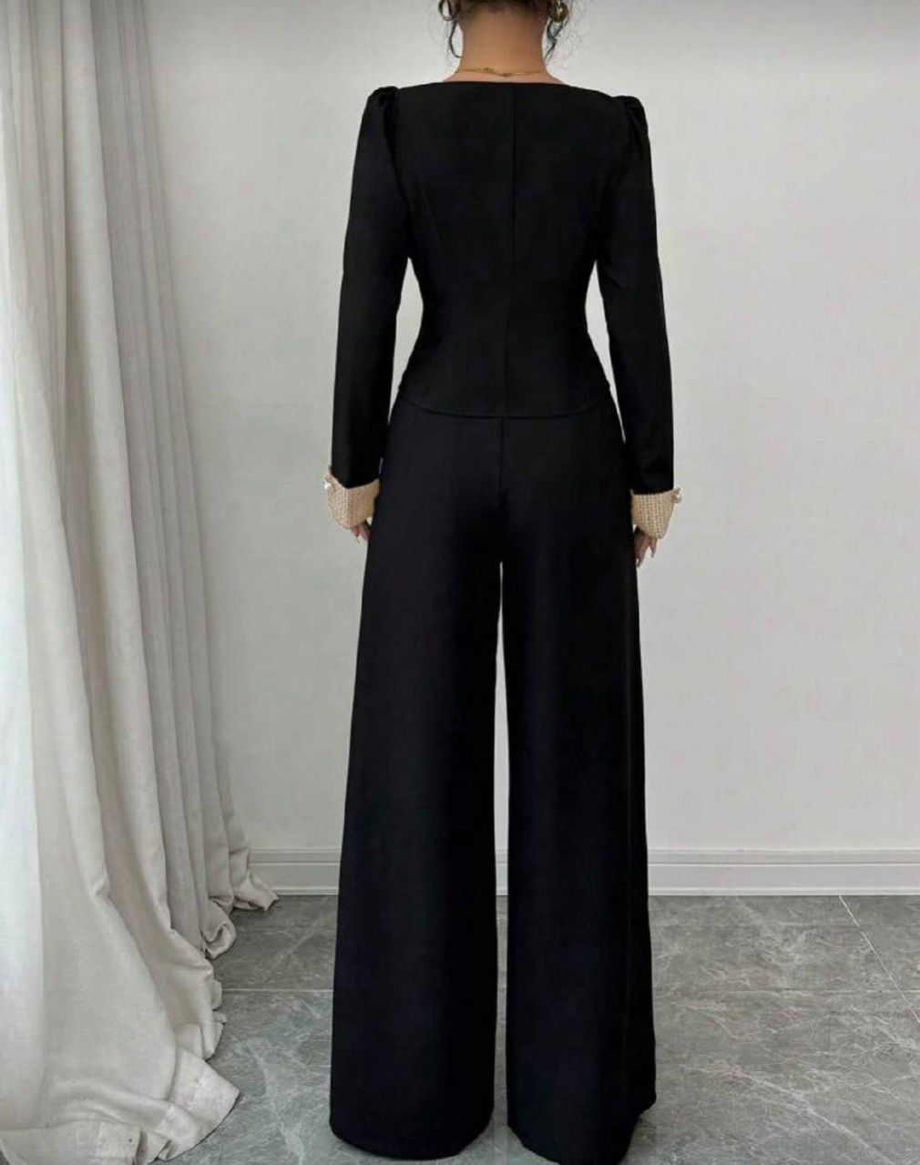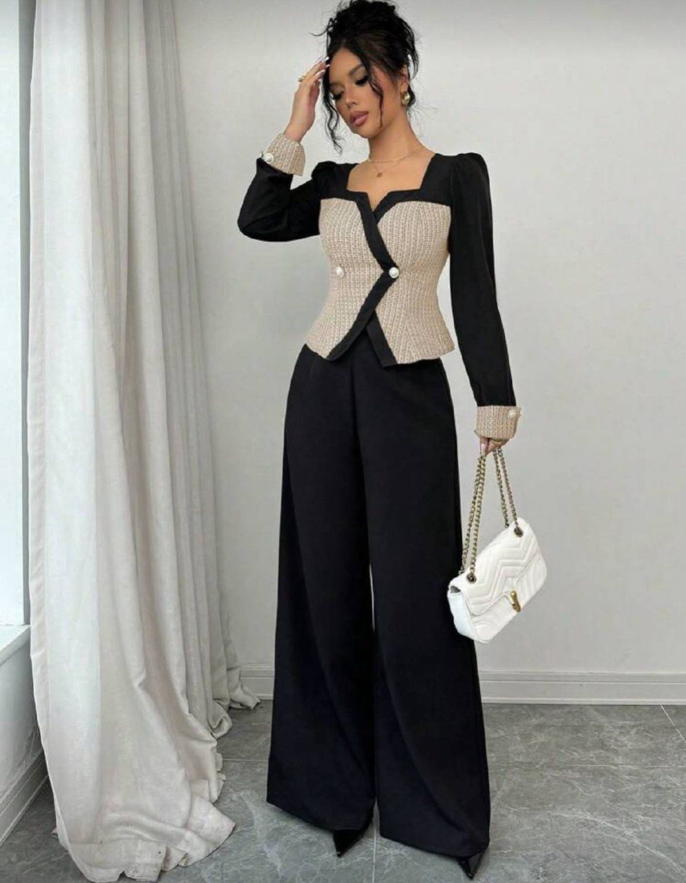 Elenzga مجموعة من السترة ذات الجزء الأمامي المفتوح والألوان المتباينة وبنطلون أرجل واسعة من اللون الأحادي للنساء