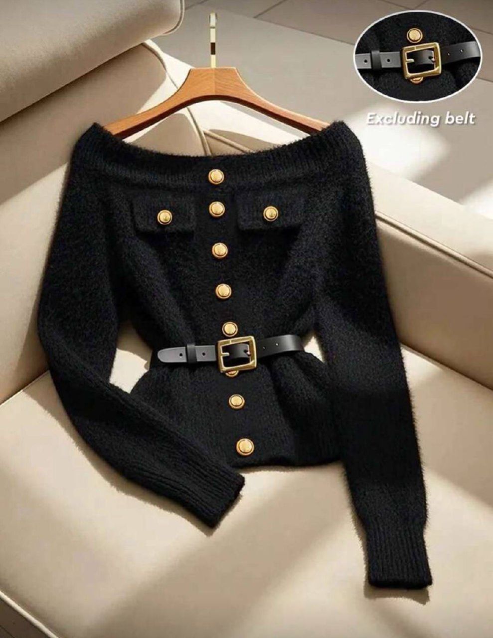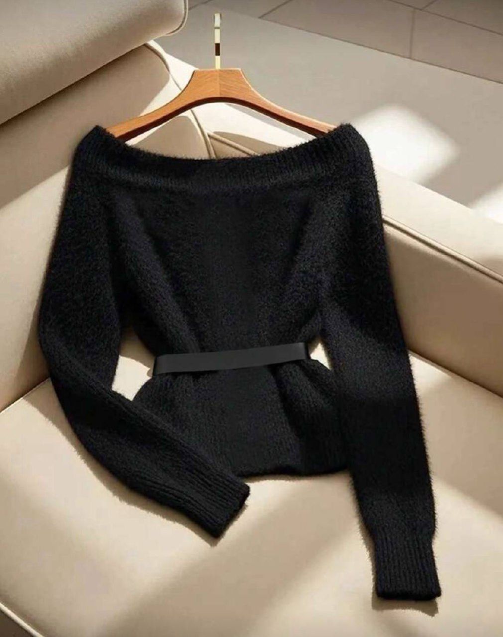 GlowEve كنزة صوفية محبوكة فاخرة سوداء بأكمام طويلة للخريف الباكر/الشتاء، كنزة صوفية نسائية مريحة للتنقل مع جيوب، قماش خريفي للنساء (بدون الحزام)