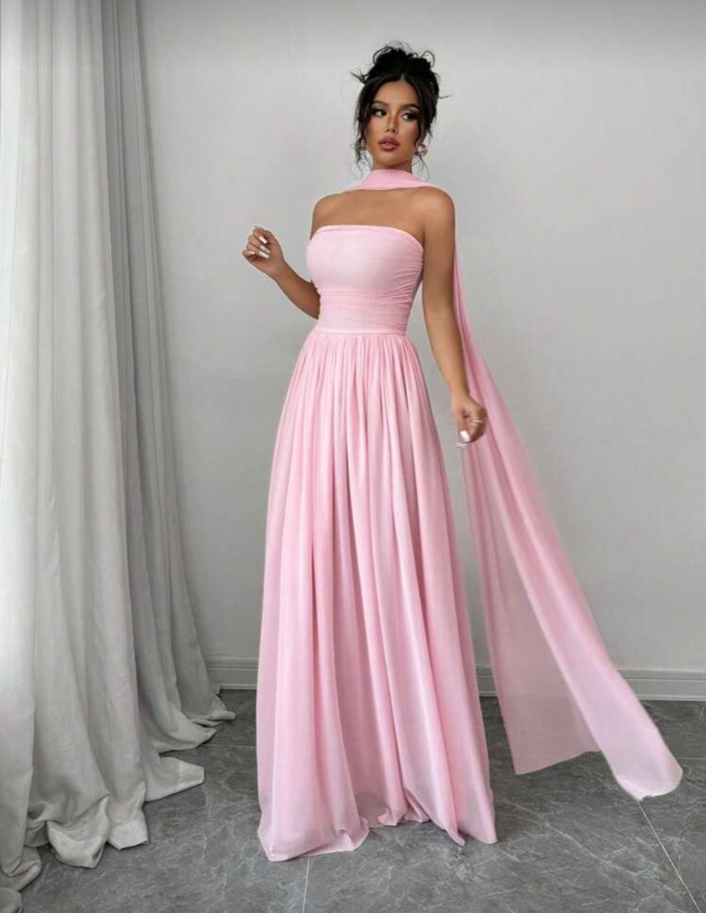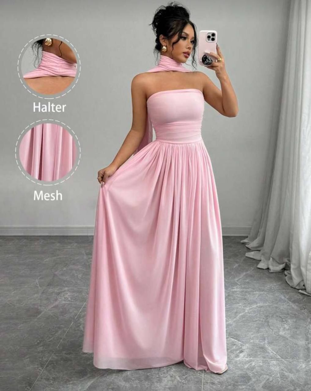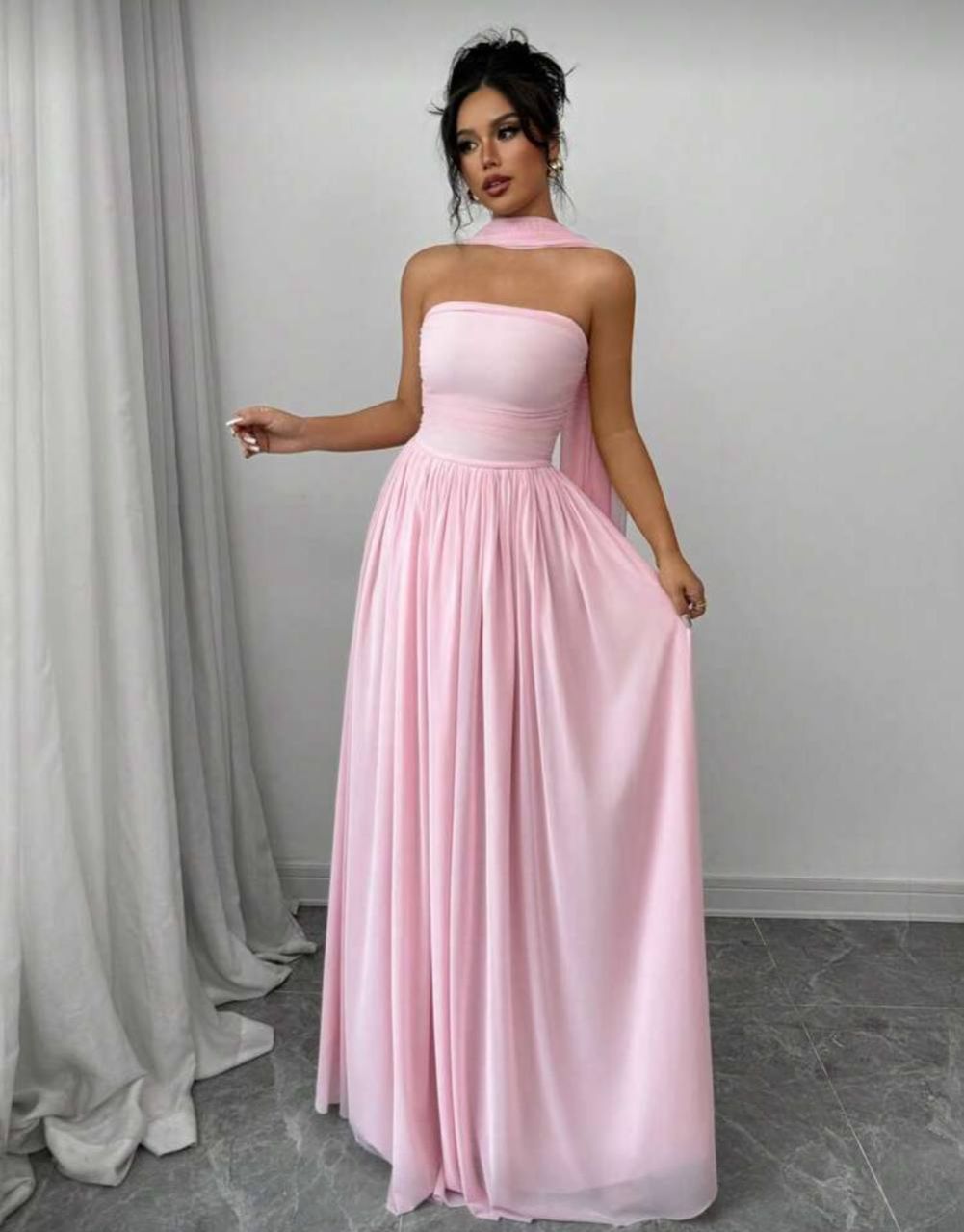 Selianne فستان طويل أنيق للنساء بقصة ماكسي بدون أكمام ولون واحد مع تفاصيل طيات، قطعة واحدة