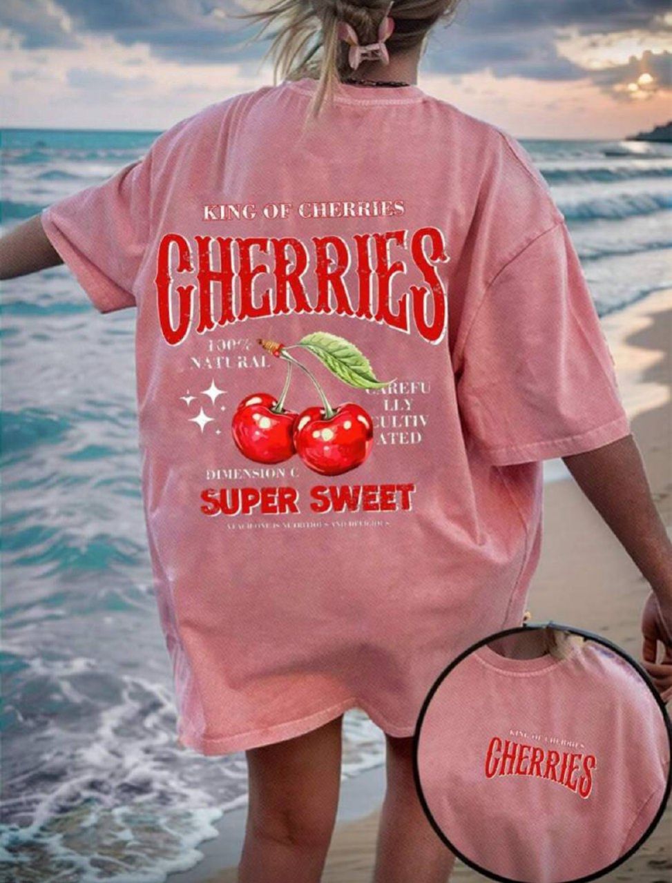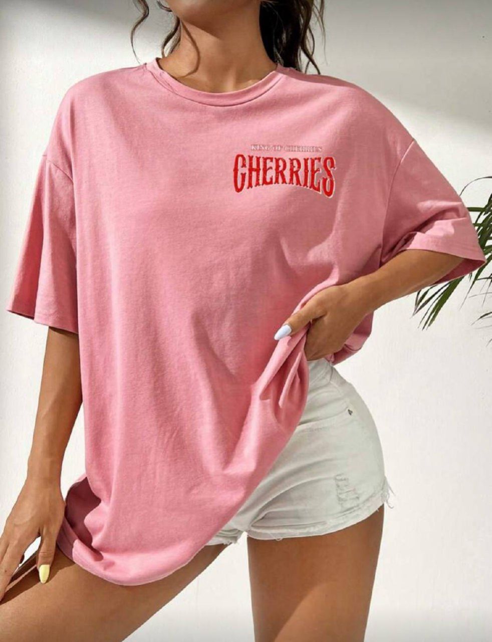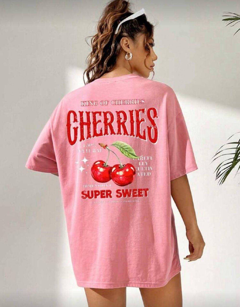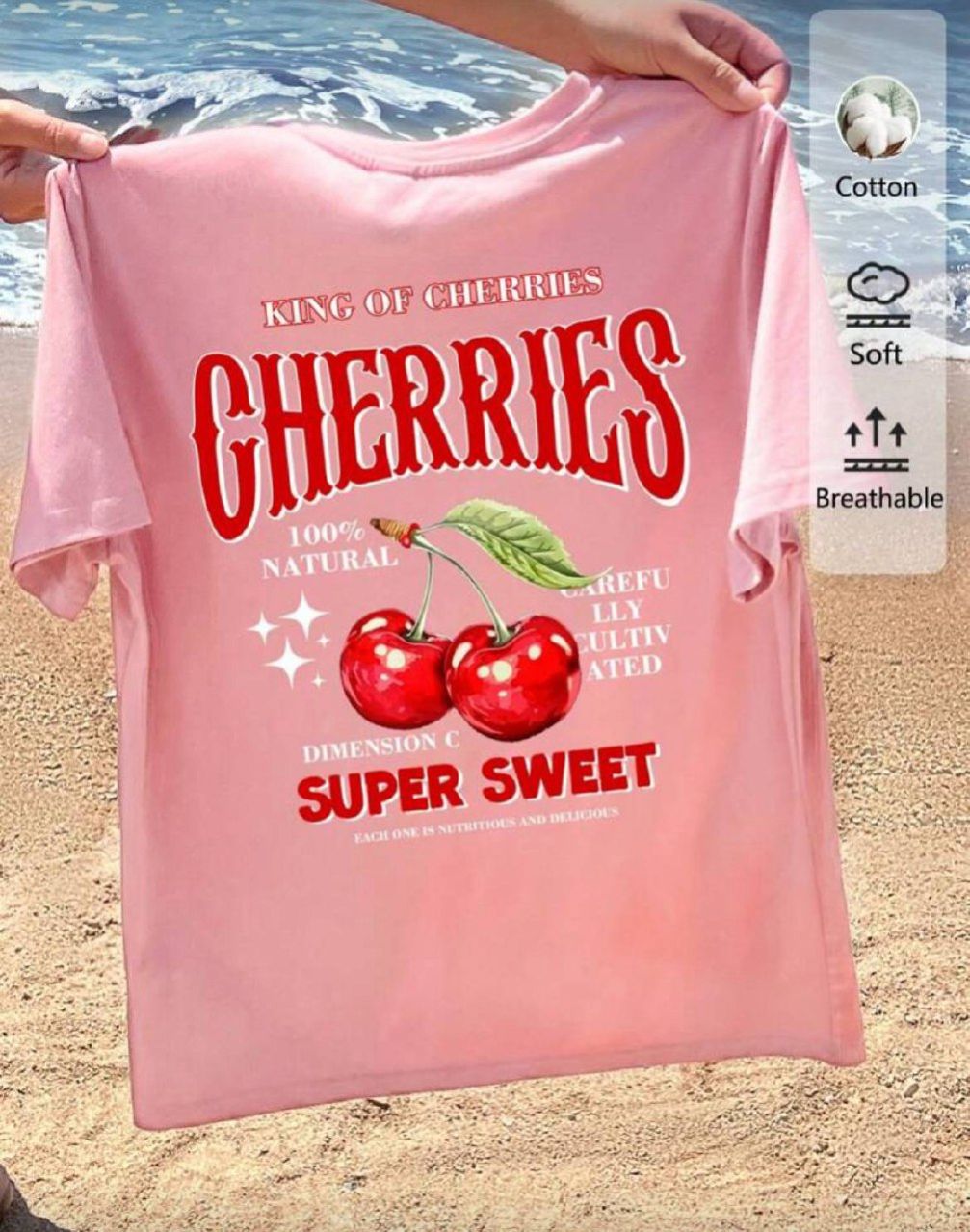 SHEIN EZwear تي شيرت فضفاض بأكمام قصيرة، وياقة مستديرة مزخرف بطباعة الكرز ، قطن مخلوط ، مناسب للنساء في فصل الصيف والعودة إلى المدرسة