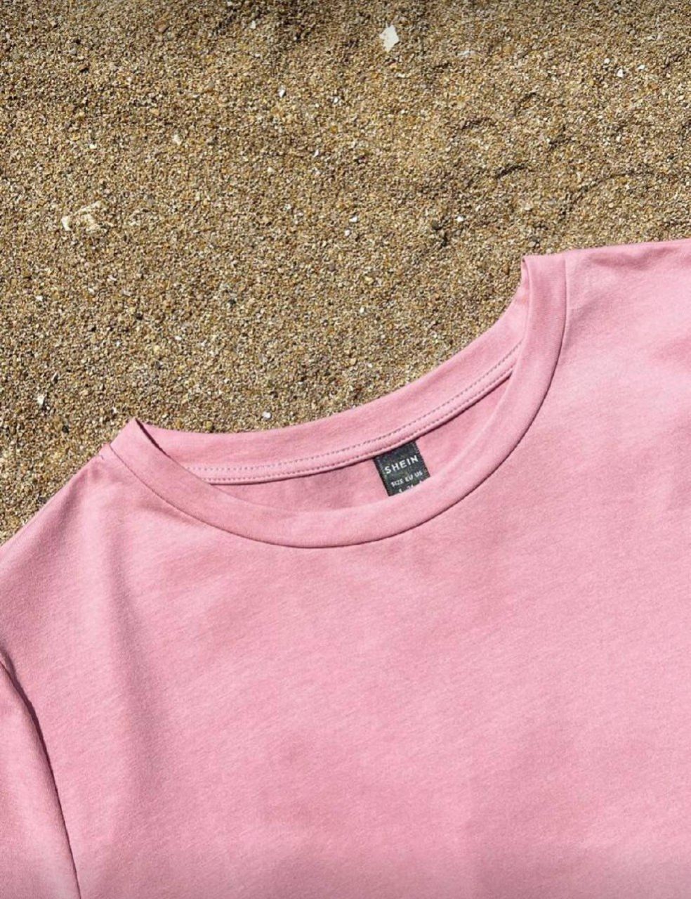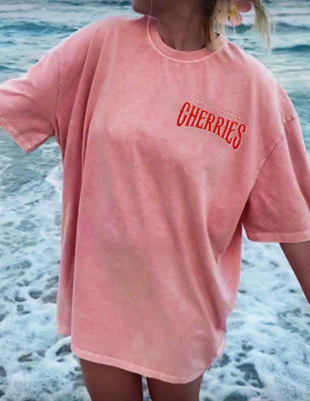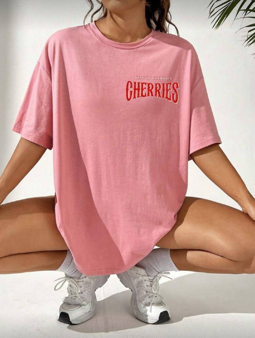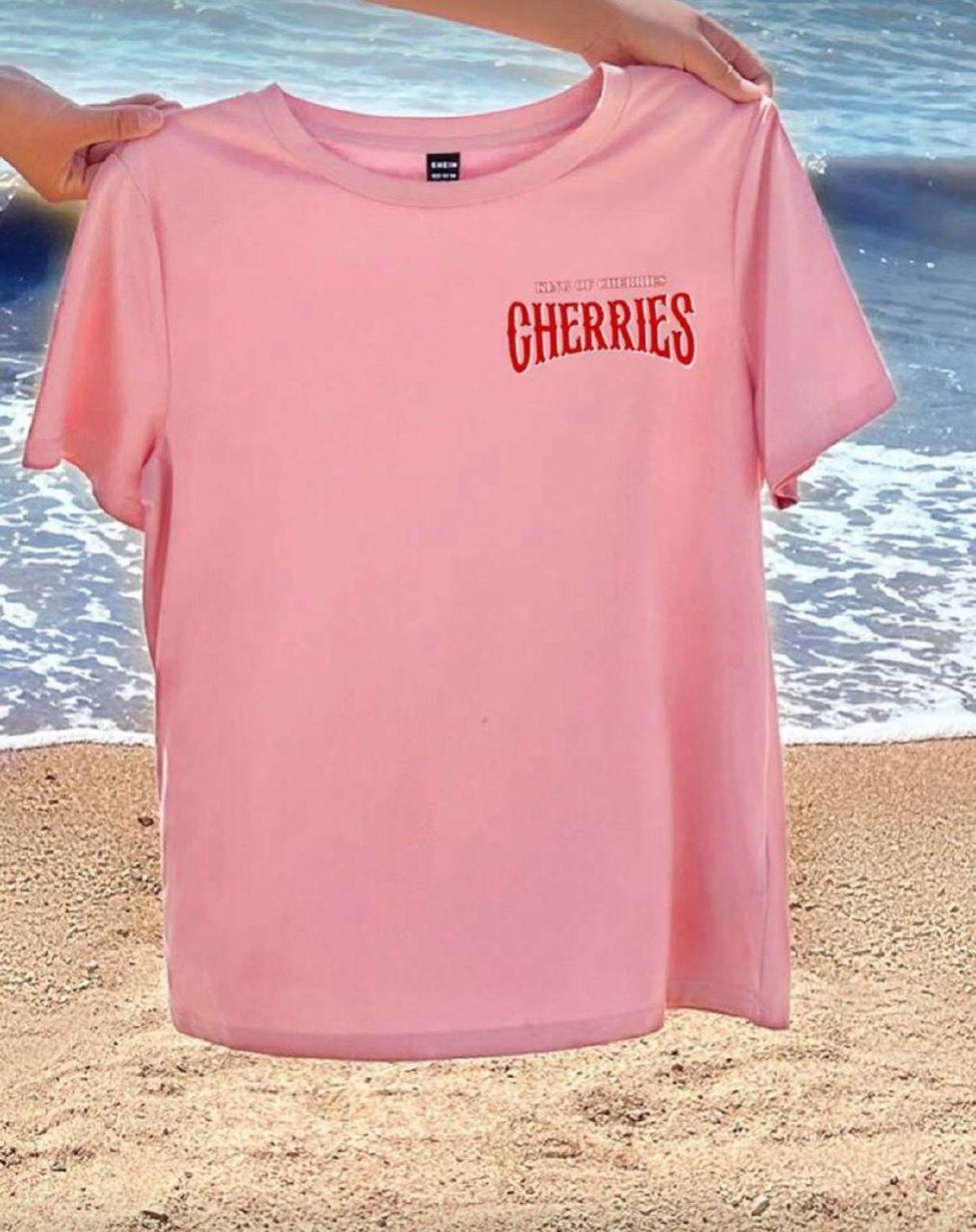 SHEIN EZwear تي شيرت فضفاض بأكمام قصيرة، وياقة مستديرة مزخرف بطباعة الكرز ، قطن مخلوط ، مناسب للنساء في فصل الصيف والعودة إلى المدرسة