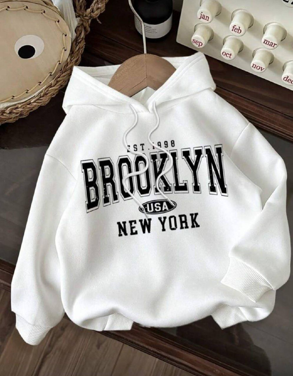 SHEIN EZwear هودي كاجوال بطباعة "نيويورك بروكلين" بأكمام طويلة وتصميم فضفاض، سميك، بلوزة رياضية مناسبة للخريف والشتاء، توب بأكمام طويلة للنساء