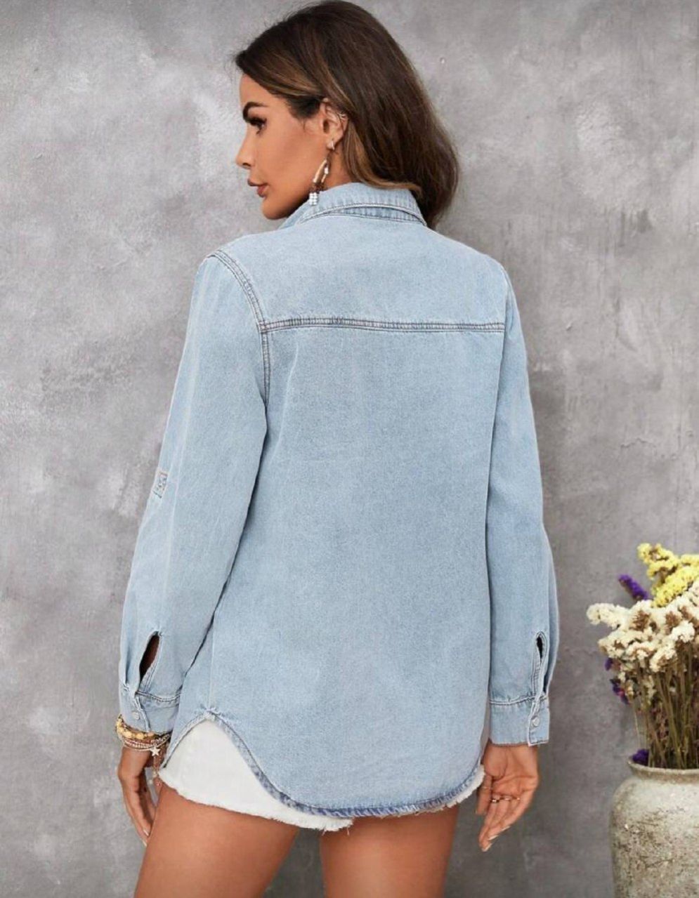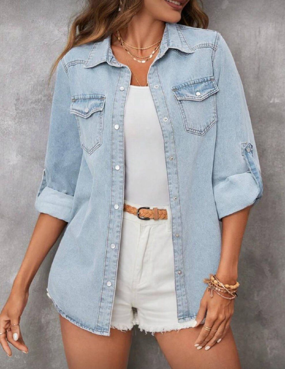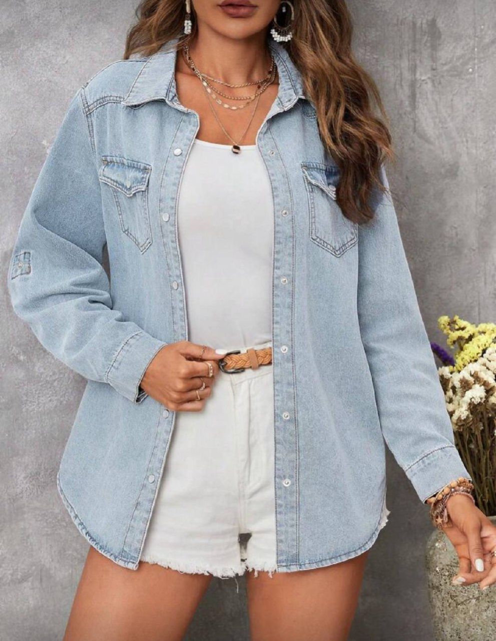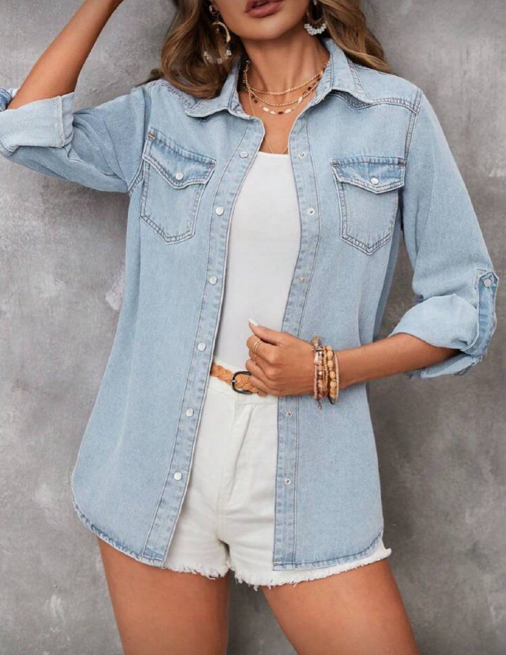 0 Review Of Product SHEIN LUNE بلوزة دينيم جيب قلاب اكمام بشريط ملتف