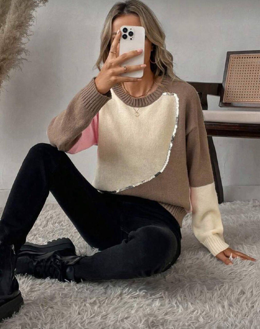 0 Review Of Product SHEIN LUNE كنزة صوفية كشمير أنيقة وعصرية عديمة الياقة مطرزة بشرائط لامعة ، أكمام طويلة ، كنزة محبوكة كاجوال مناسبة للخروج ، الحفلات والأوقات الحرة