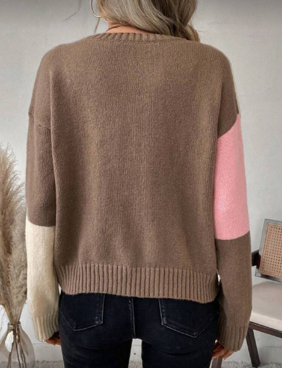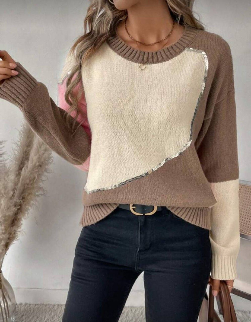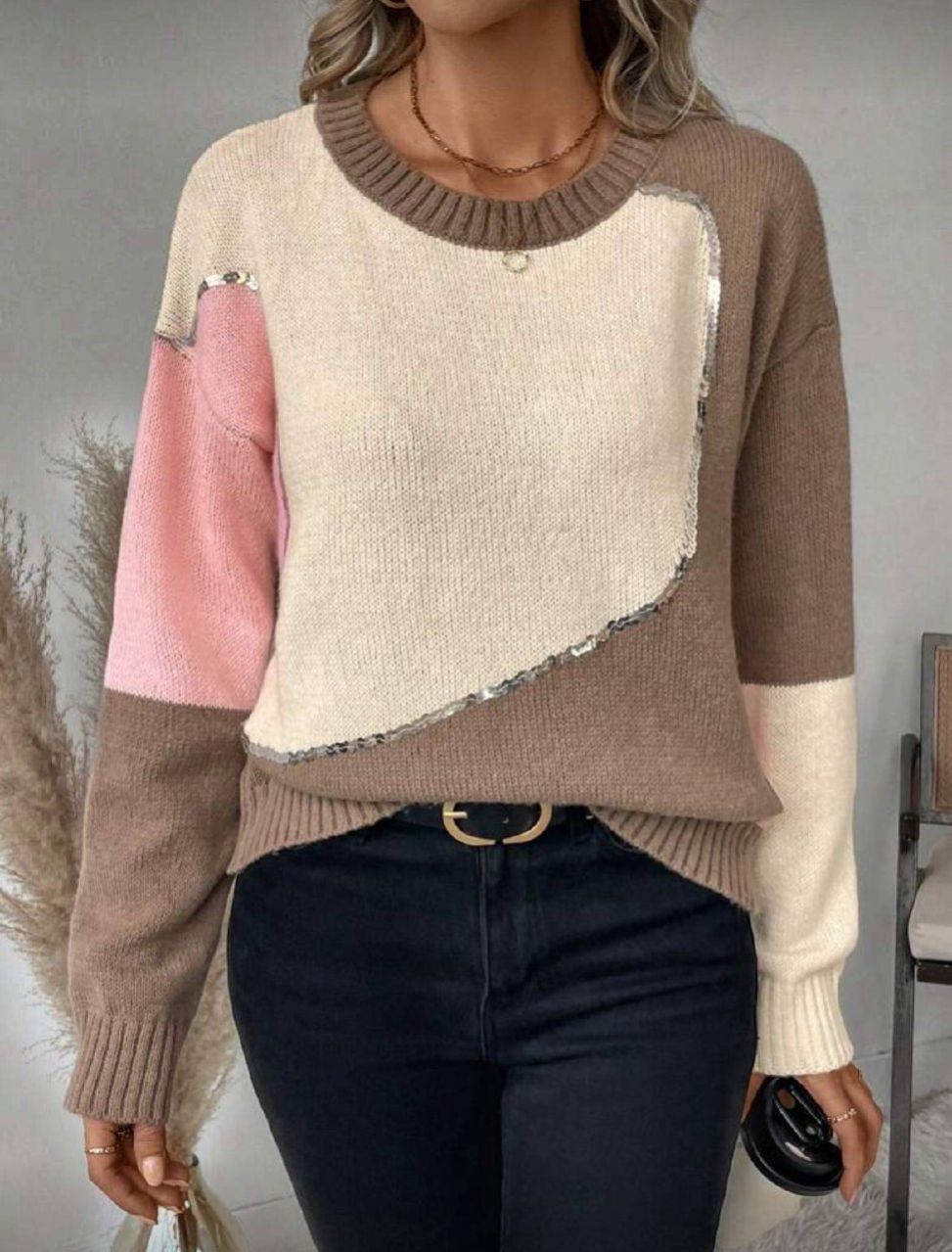SHEIN LUNE كنزة صوفية كشمير أنيقة وعصرية عديمة الياقة مطرزة بشرائط لامعة ، أكمام طويلة ، كنزة محبوكة كاجوال مناسبة للخروج ، الحفلات والأوقات الحرة