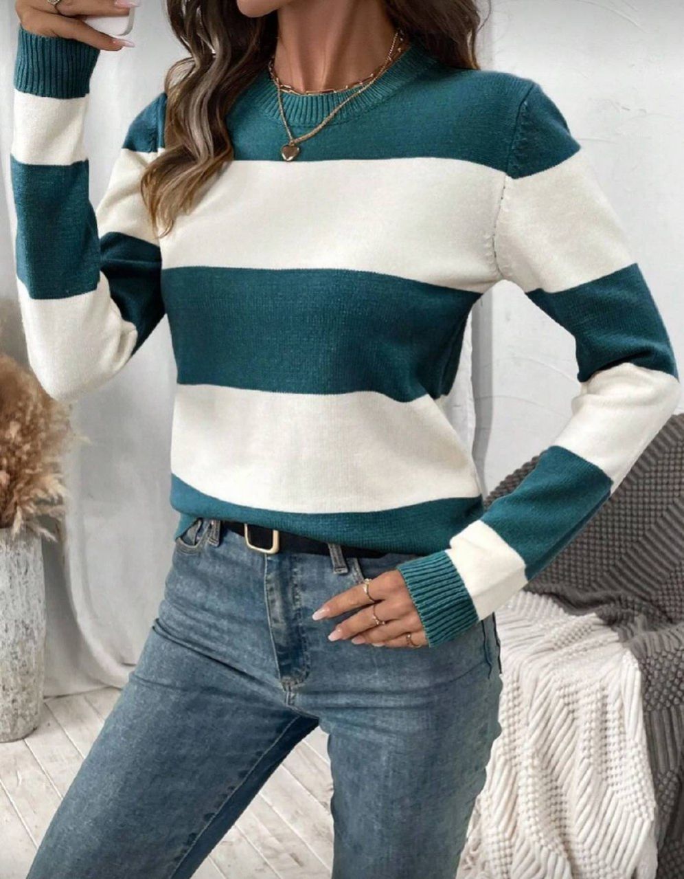 SHEIN PETITE كنزة صوفية كاجوال للنساء للخريف/الشتاء، متعددة الاستخدامات وأنيقة للخروجات والمواعيد والعمل والمدرسة والأعياد مثل يوم الاستقلال ويوم العمال ويوم كولومبس وعيد الشكر وعيد الحب. بطراز فينتاج وسكندنافي وكوري، بتصميم كتل لونية ومخطط محبوك