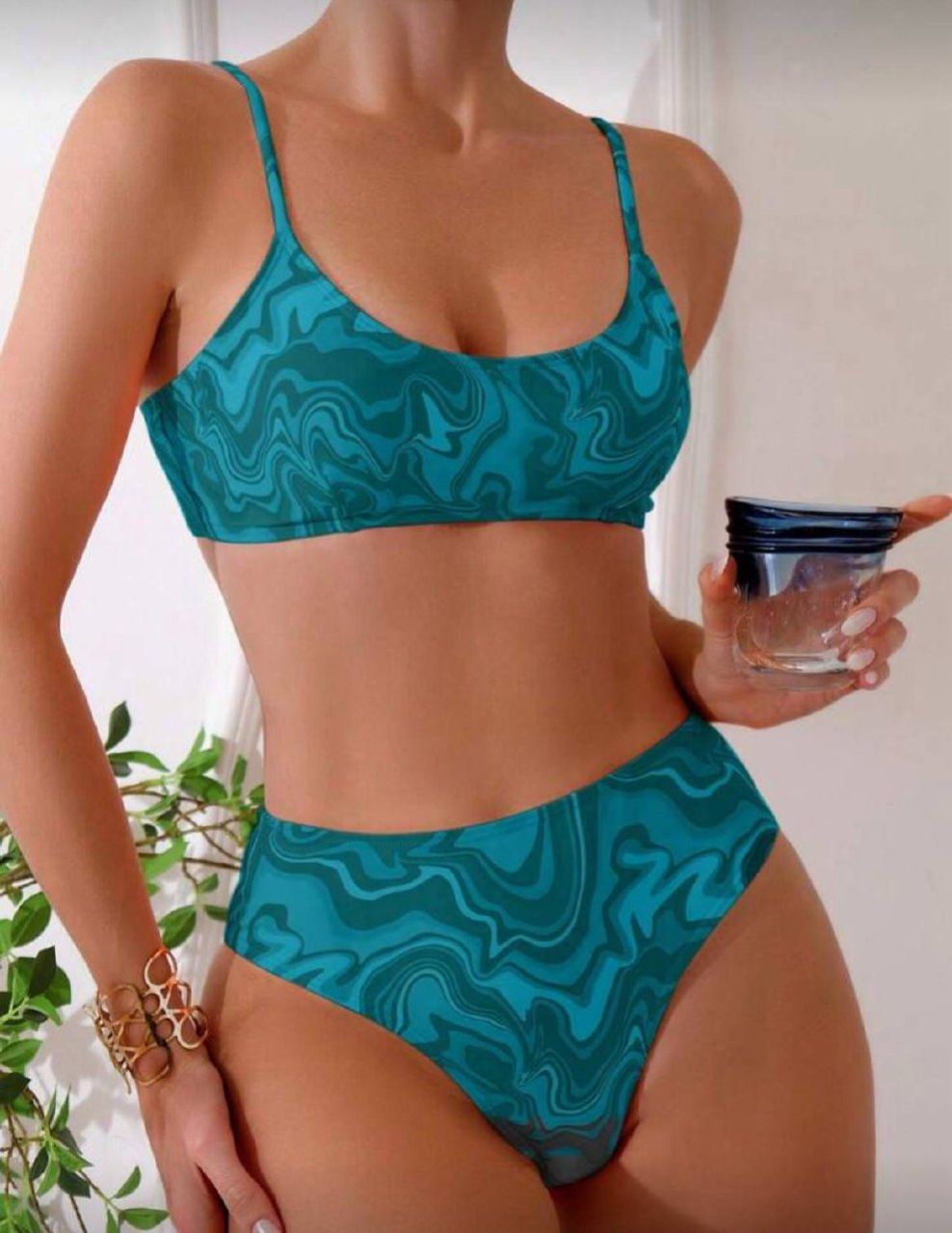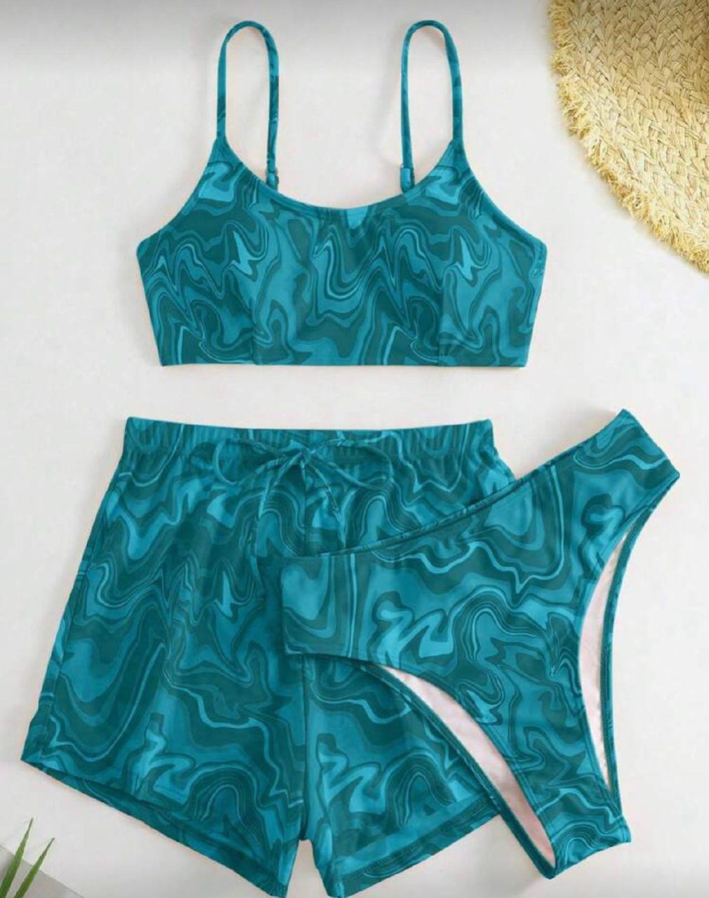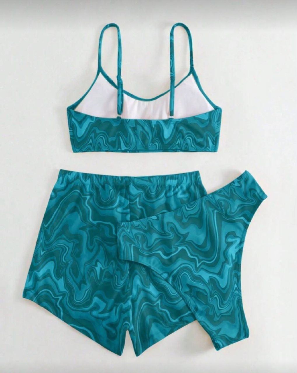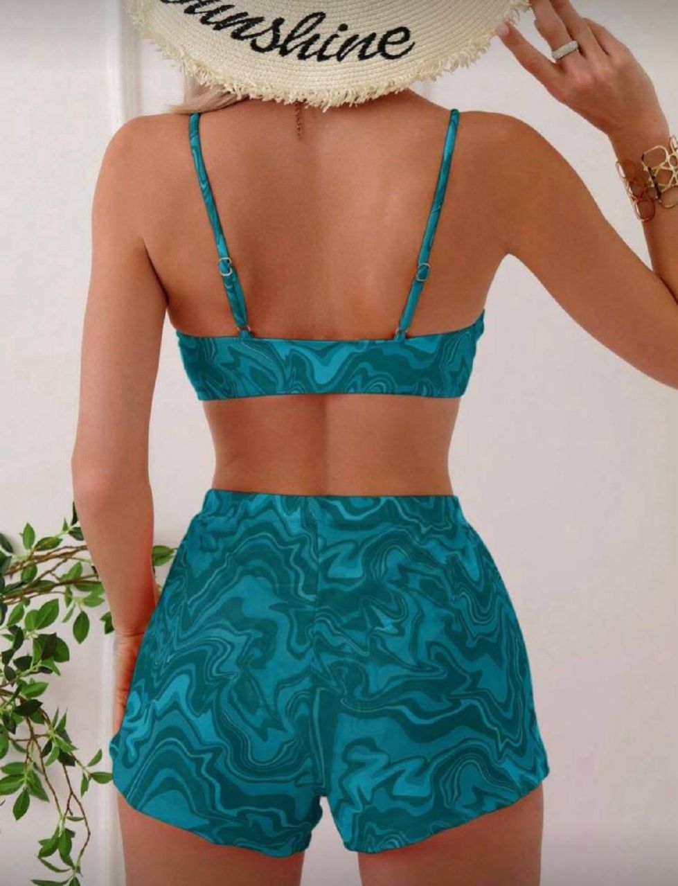 Swim Lushoire طقم بكيني كاجوال بطباعة رخامية للنساء في العطلة، طقم بكيني قطعتين مع شورت غطاء، طباعة عشوائية للشاطئ الصيفي
